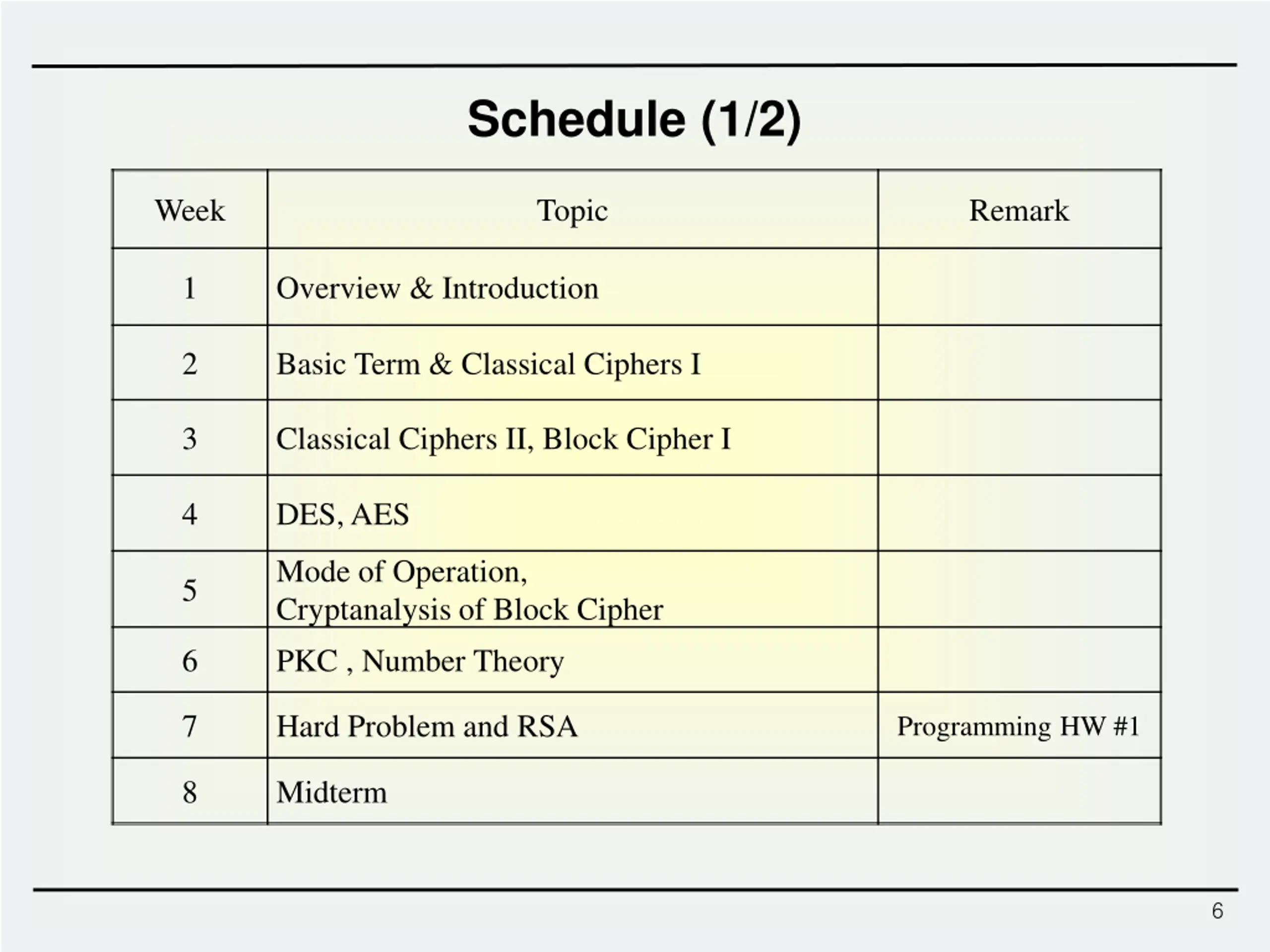 Schedule (1/2) Week Topic Remark 1 Overview & Introduction 2 Basic Term & Classical Ciphers I 3 Classical Ciphers II, Block Cipher I 4 DES, AES Mode of Operation, Cryptanalysis of Block Cipher PKC , Number Theory 5 6 7 Hard Problem and RSA Programming HW #1 8 Midterm 6