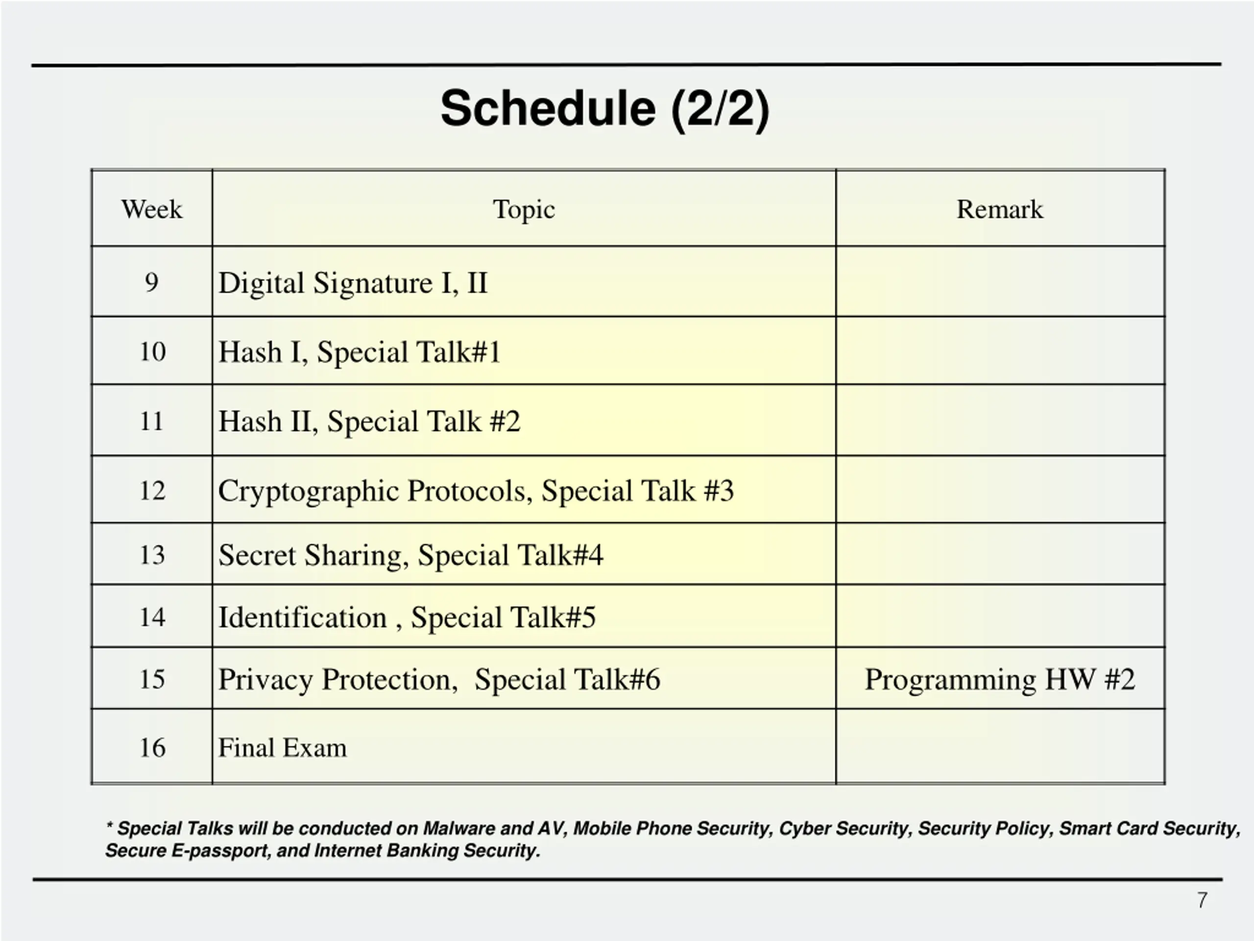 Schedule (2/2) Week Topic Remark Digital Signature I, II 9 Hash I, Special Talk#1 10 Hash II, Special Talk #2 11 Cryptographic Protocols, Special Talk #3 12 Secret Sharing, Special Talk#4 13 Identification , Special Talk#5 14 Privacy Protection, Special Talk#6 Programming HW #2 15 16 Final Exam * Special Talks will be conducted on Malware and AV, Mobile Phone Security, Cyber Security, Security Policy, Smart Card Security, Secure E-passport, and Internet Banking Security. 7