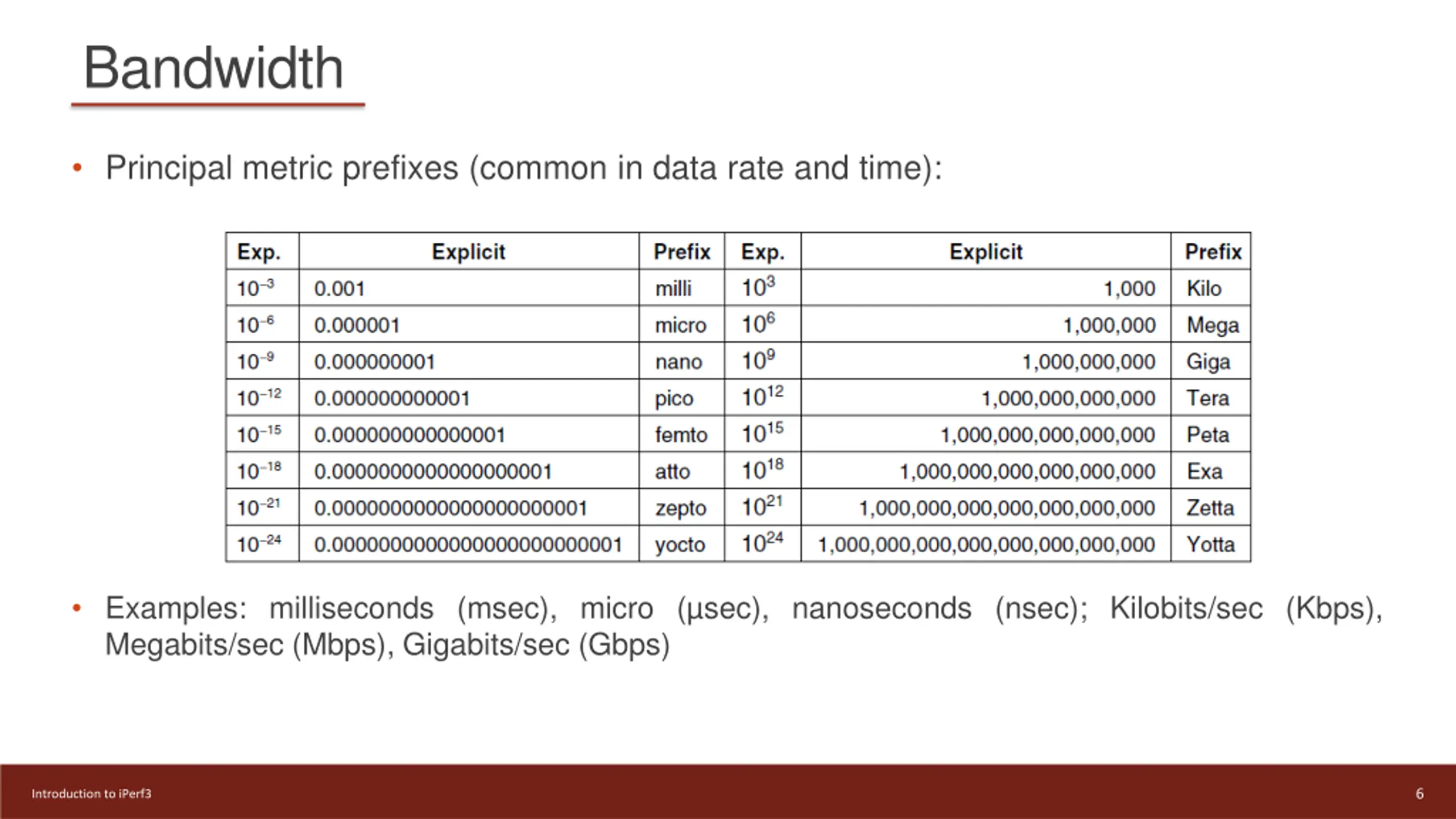 Bandwidth Principal metric prefixes (common in data rate and time): Examples: milliseconds (msec), micro ( sec), nanoseconds (nsec); Kilobits/sec (Kbps), Megabits/sec (Mbps), Gigabits/sec (Gbps) 6 Introduction to iPerf3