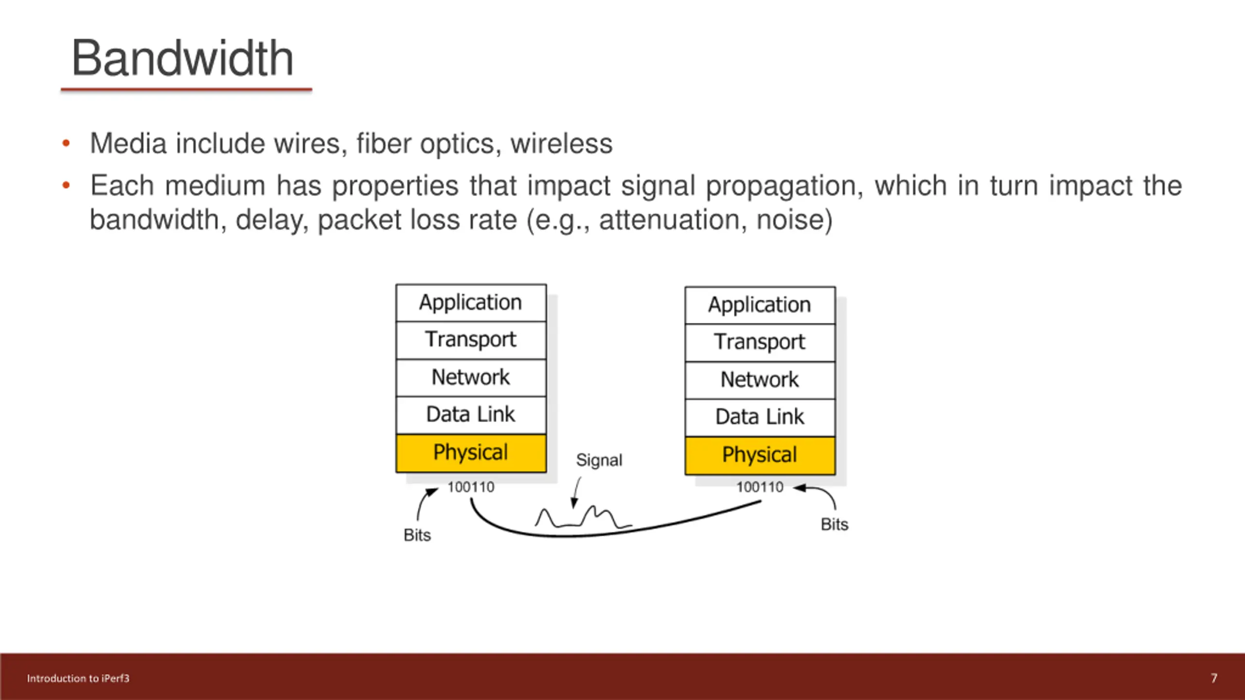 Bandwidth Media include wires, fiber optics, wireless Each medium has properties that impact signal propagation, which in turn impact the bandwidth, delay, packet loss rate (e.g., attenuation, noise) 7 Introduction to iPerf3