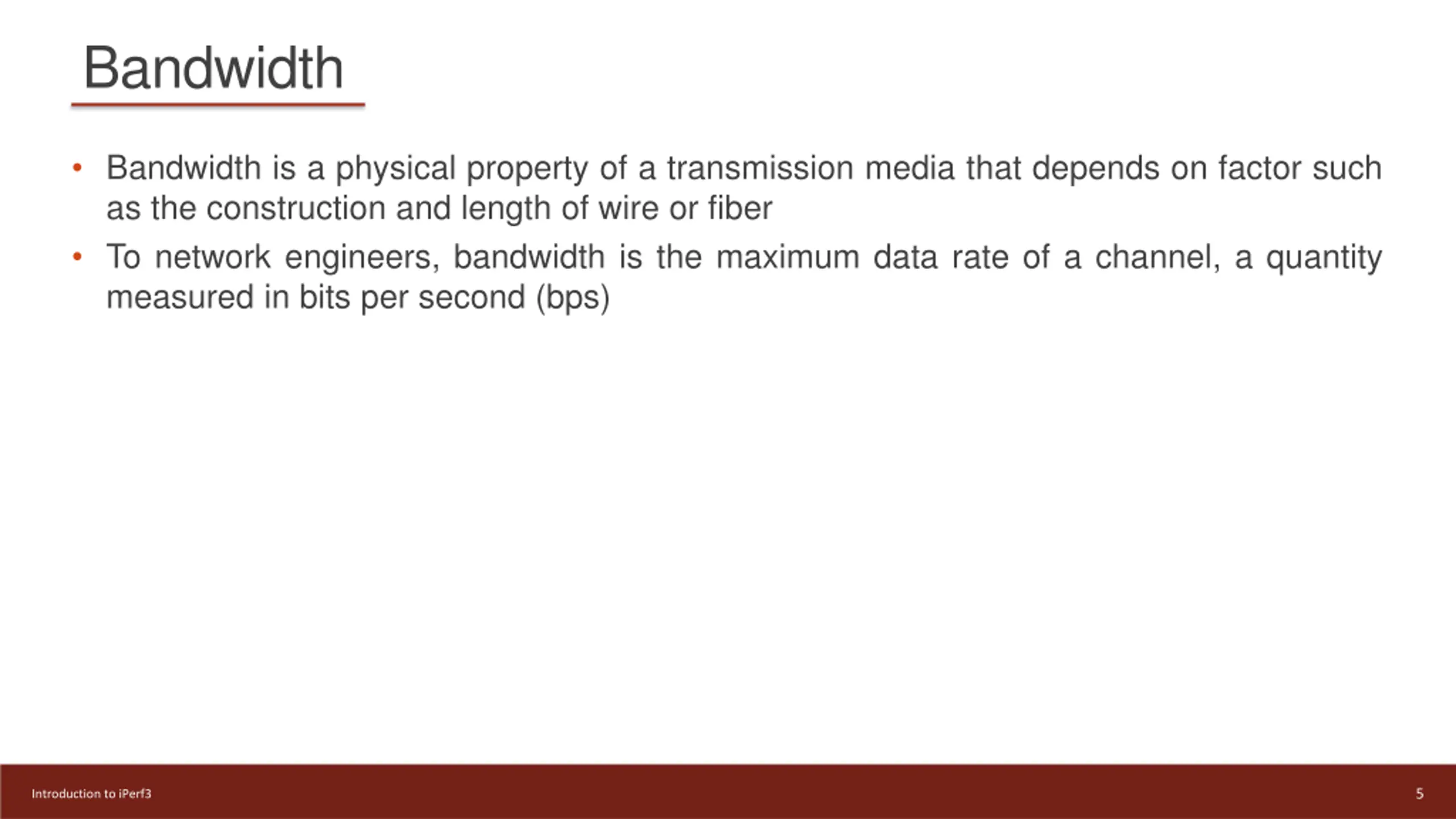 Bandwidth Bandwidth is a physical property of a transmission media that depends on factor such as the construction and length of wire or fiber To network engineers, bandwidth is the maximum data rate of a channel, a quantity measured in bits per second (bps) 5 Introduction to iPerf3