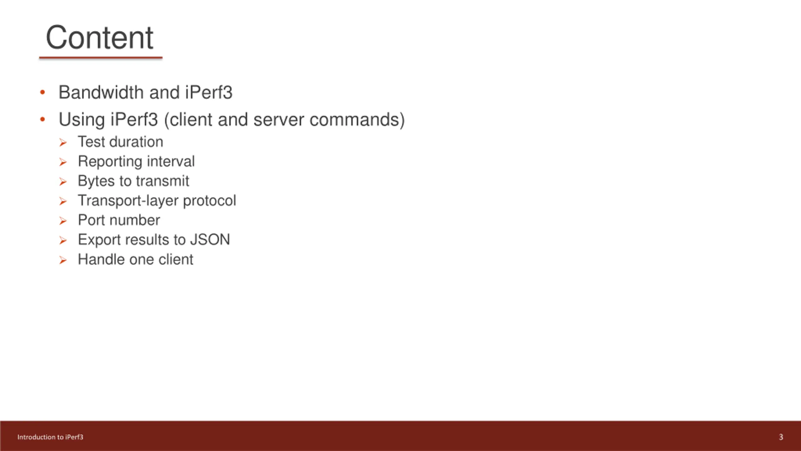 Content Bandwidth and iPerf3 Using iPerf3 (client and server commands) Test duration Reporting interval Bytes to transmit Transport-layer protocol Port number Export results to JSON Handle one client 3 Introduction to iPerf3