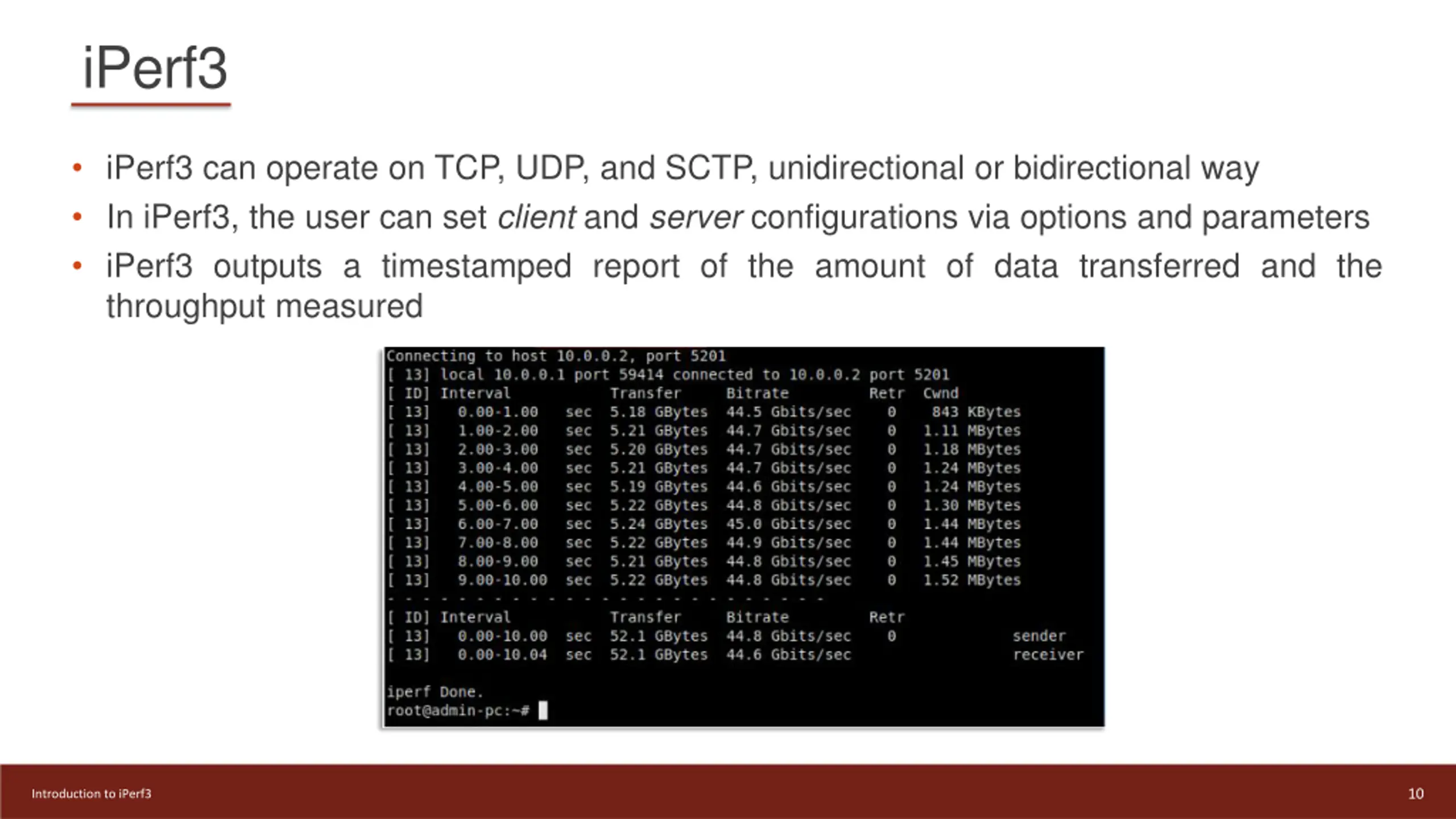 iPerf3 iPerf3 can operate on TCP, UDP, and SCTP, unidirectional or bidirectional way In iPerf3, the user can set client and server configurations via options and parameters iPerf3 outputs a timestamped report of the amount of data transferred and the throughput measured 10 Introduction to iPerf3