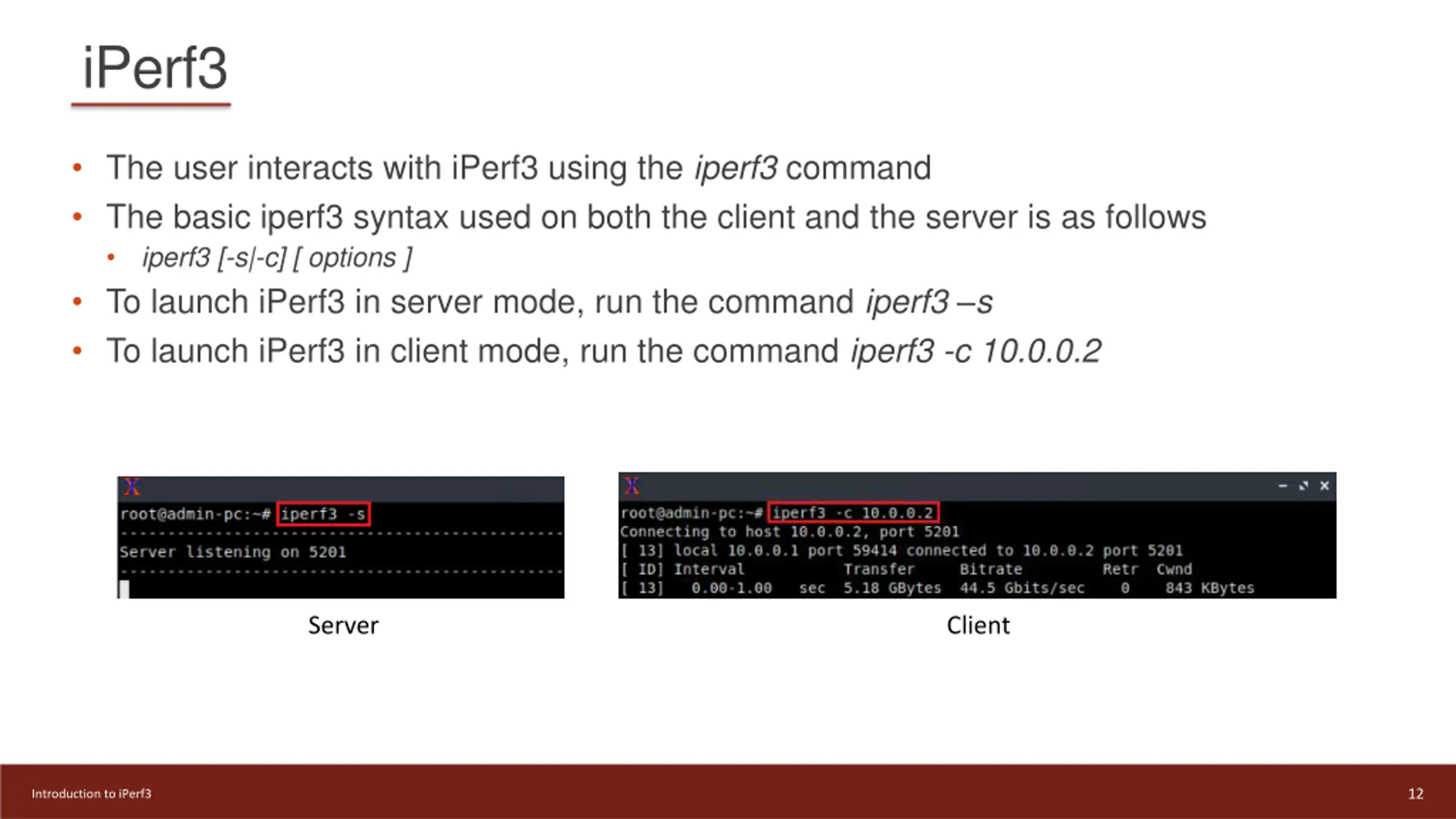 iPerf3 The user interacts with iPerf3 using the iperf3 command The basic iperf3 syntax used on both the client and the server is as follows iperf3 [-s|-c] [ options ] To launch iPerf3 in server mode, run the command iperf3 s To launch iPerf3 in client mode, run the command iperf3 -c 10.0.0.2 Server Client 12 Introduction to iPerf3