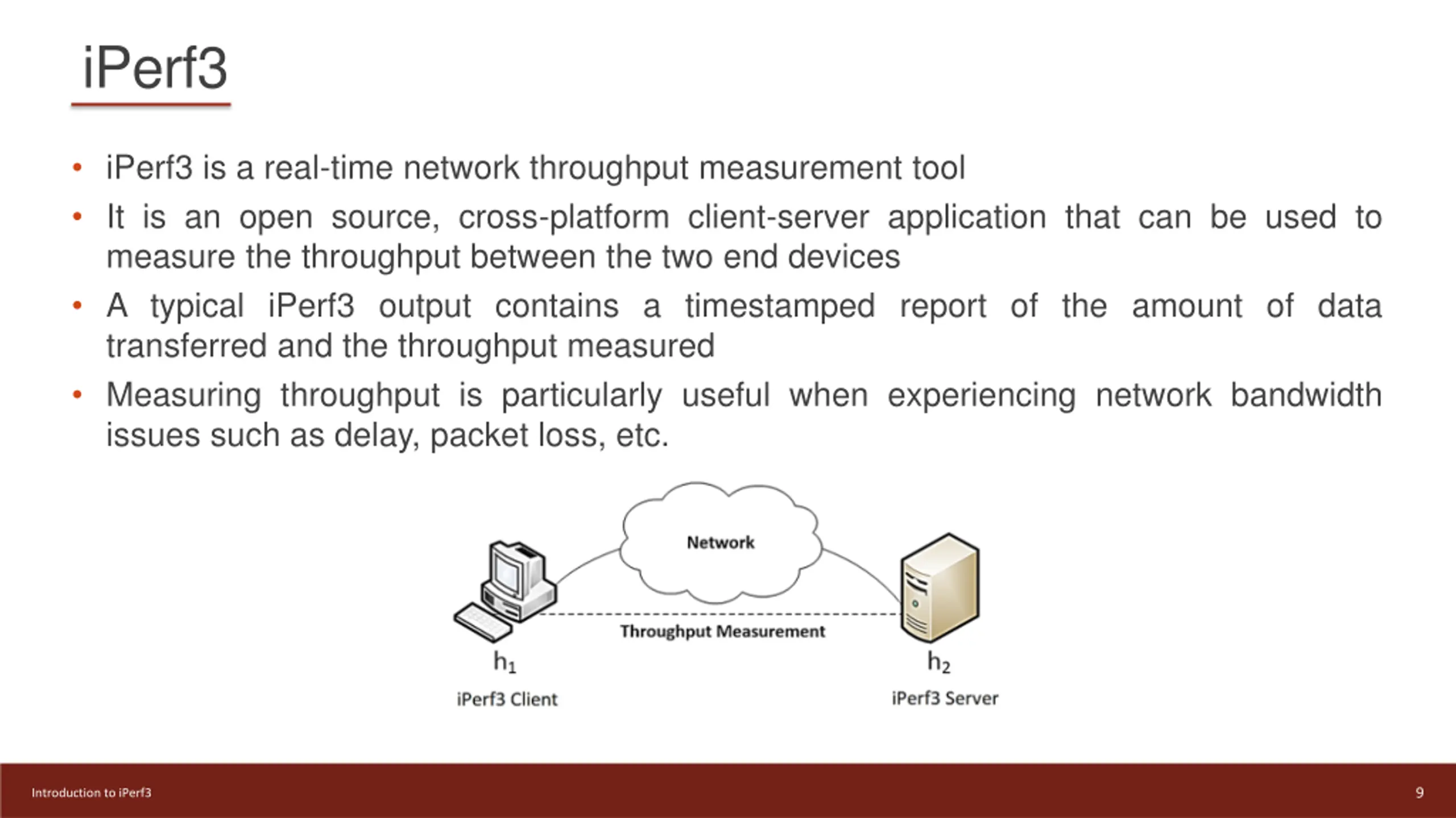 iPerf3 iPerf3 is a real-time network throughput measurement tool It is an open source, cross-platform client-server application that can be used to measure the throughput between the two end devices A typical iPerf3 output contains a timestamped report of the amount of data transferred and the throughput measured Measuring throughput is particularly useful when experiencing network bandwidth issues such as delay, packet loss, etc. 9 Introduction to iPerf3