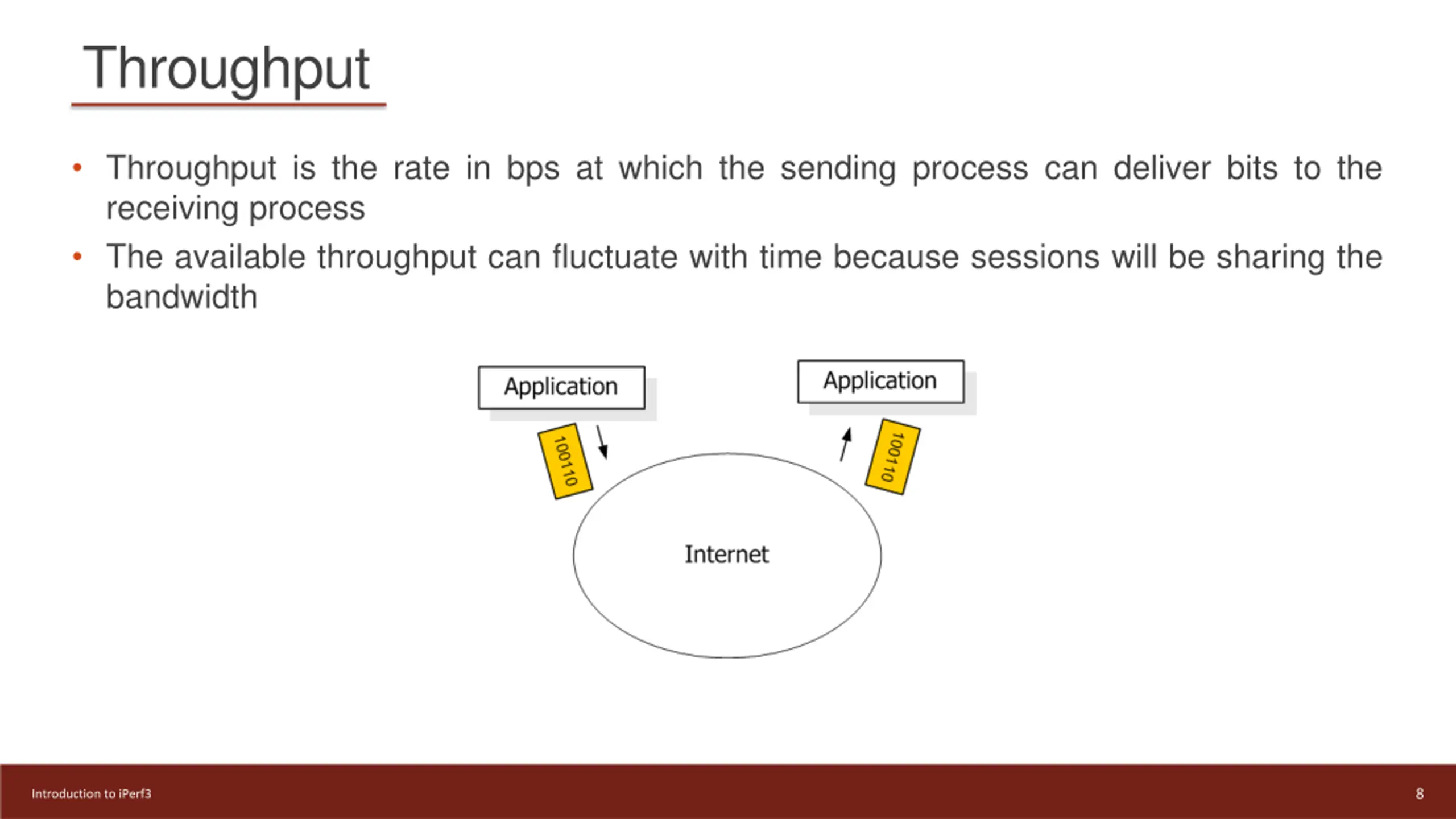 Throughput Throughput is the rate in bps at which the sending process can deliver bits to the receiving process The available throughput can fluctuate with time because sessions will be sharing the bandwidth 8 Introduction to iPerf3