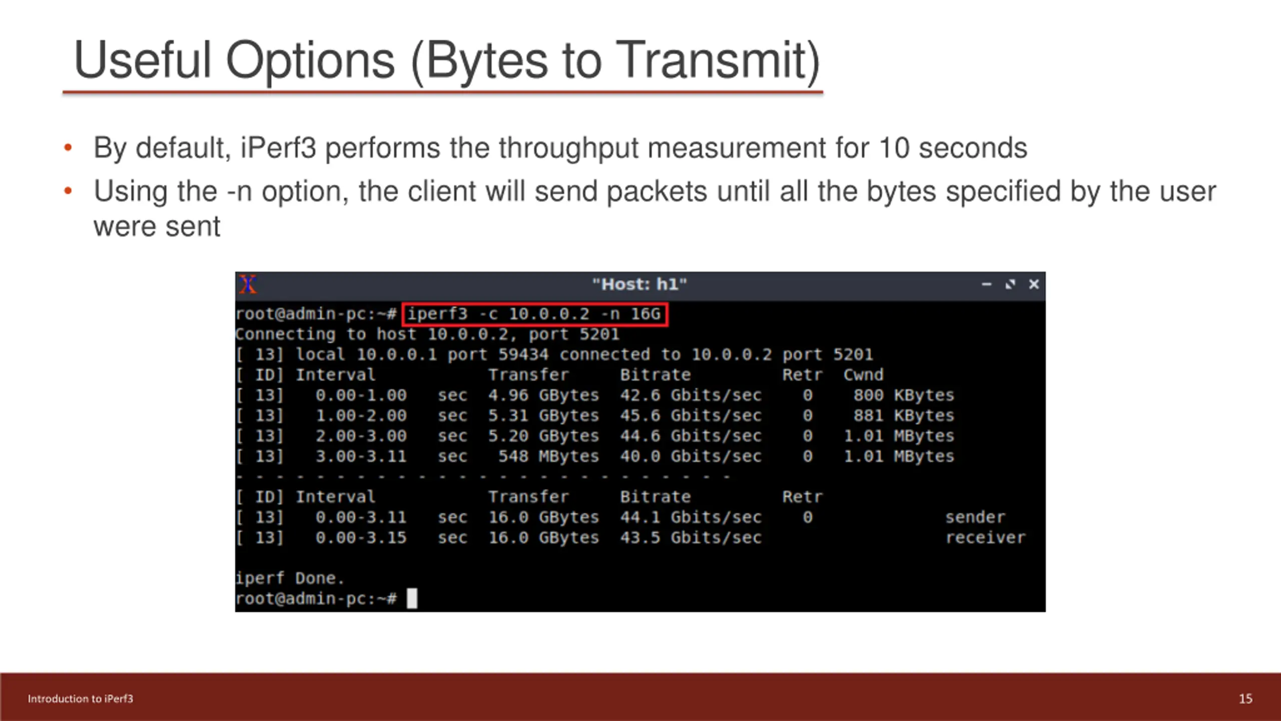 Useful Options (Bytes to Transmit) By default, iPerf3 performs the throughput measurement for 10 seconds Using the -n option, the client will send packets until all the bytes specified by the user were sent 15 Introduction to iPerf3