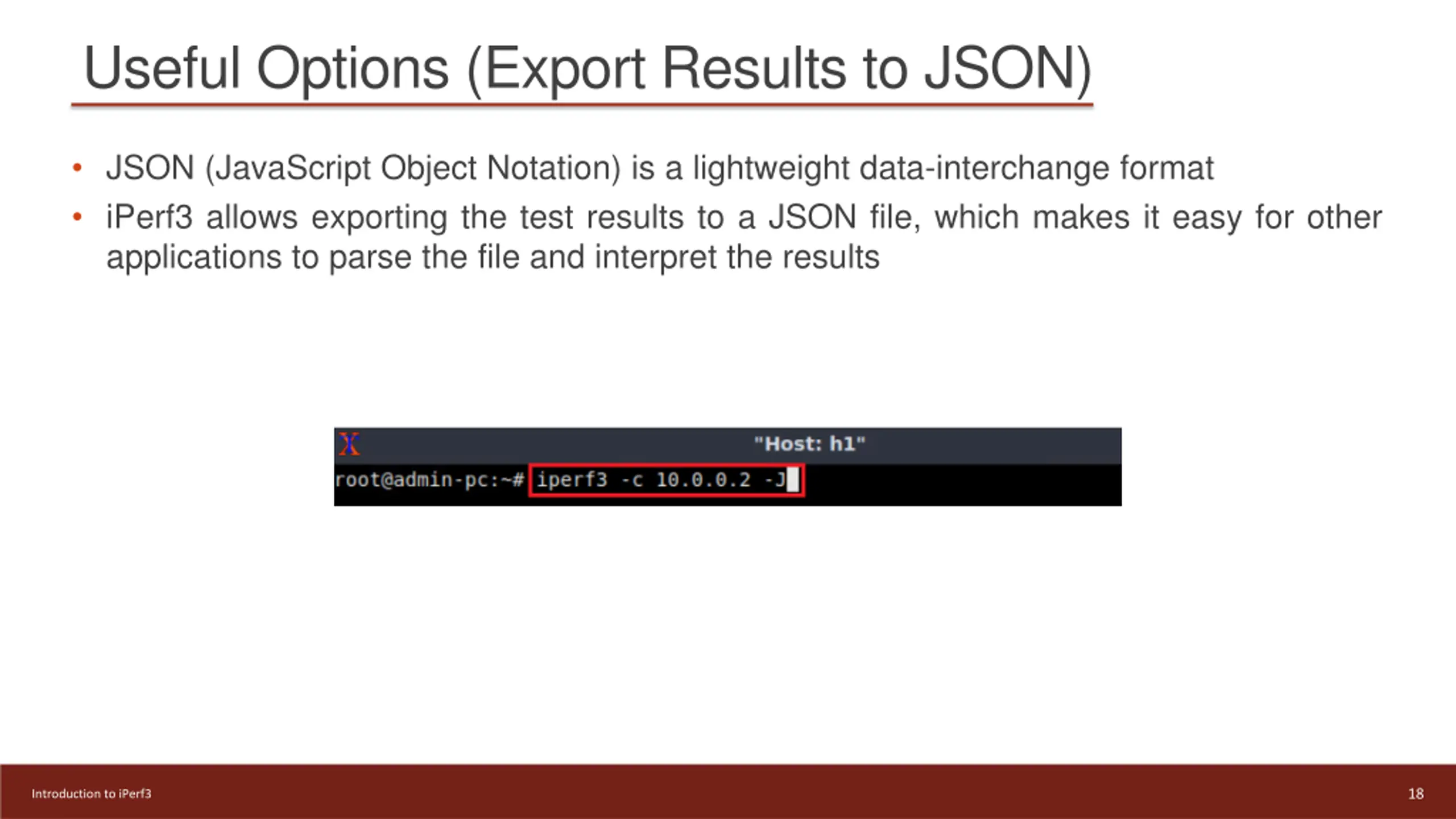 Useful Options (Export Results to JSON) JSON (JavaScript Object Notation) is a lightweight data-interchange format iPerf3 allows exporting the test results to a JSON file, which makes it easy for other applications to parse the file and interpret the results 18 Introduction to iPerf3