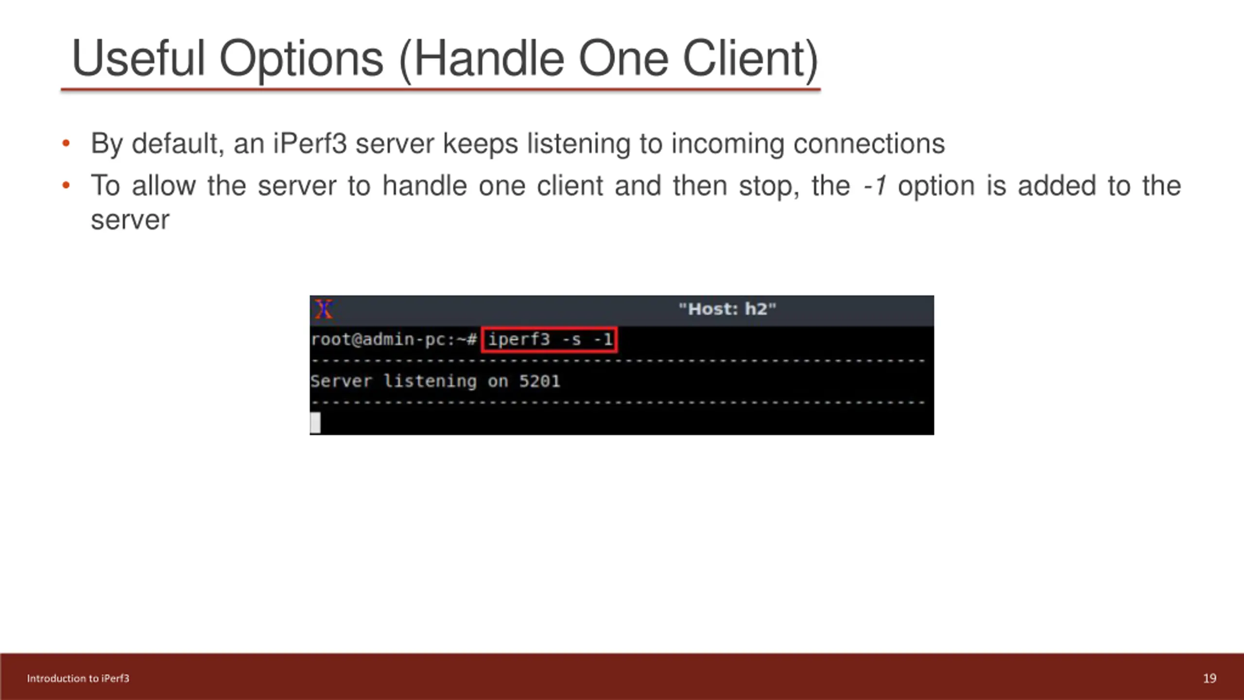 Useful Options (Handle One Client) By default, an iPerf3 server keeps listening to incoming connections To allow the server to handle one client and then stop, the -1 option is added to the server 19 Introduction to iPerf3