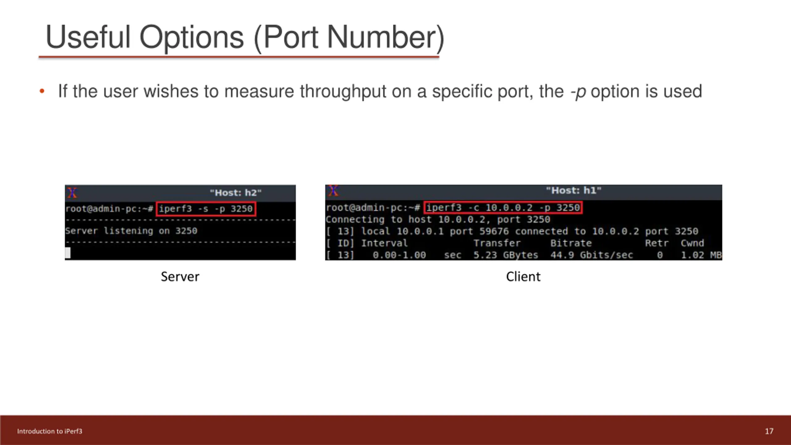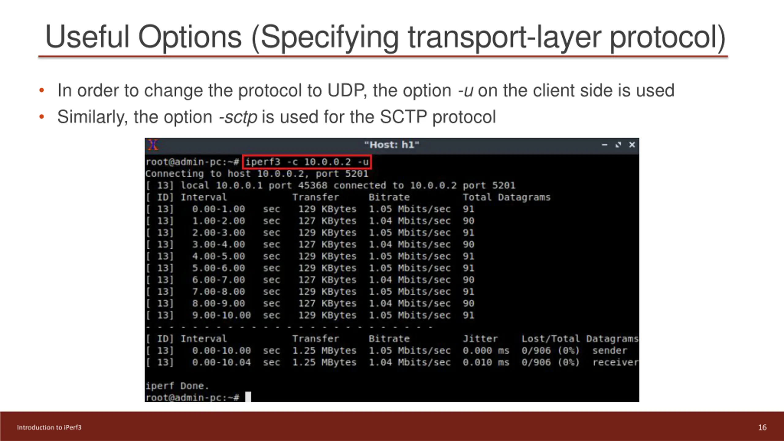 Useful Options (Specifying transport-layer protocol) In order to change the protocol to UDP, the option -u on the client side is used Similarly, the option -sctp is used for the SCTP protocol 16 Introduction to iPerf3