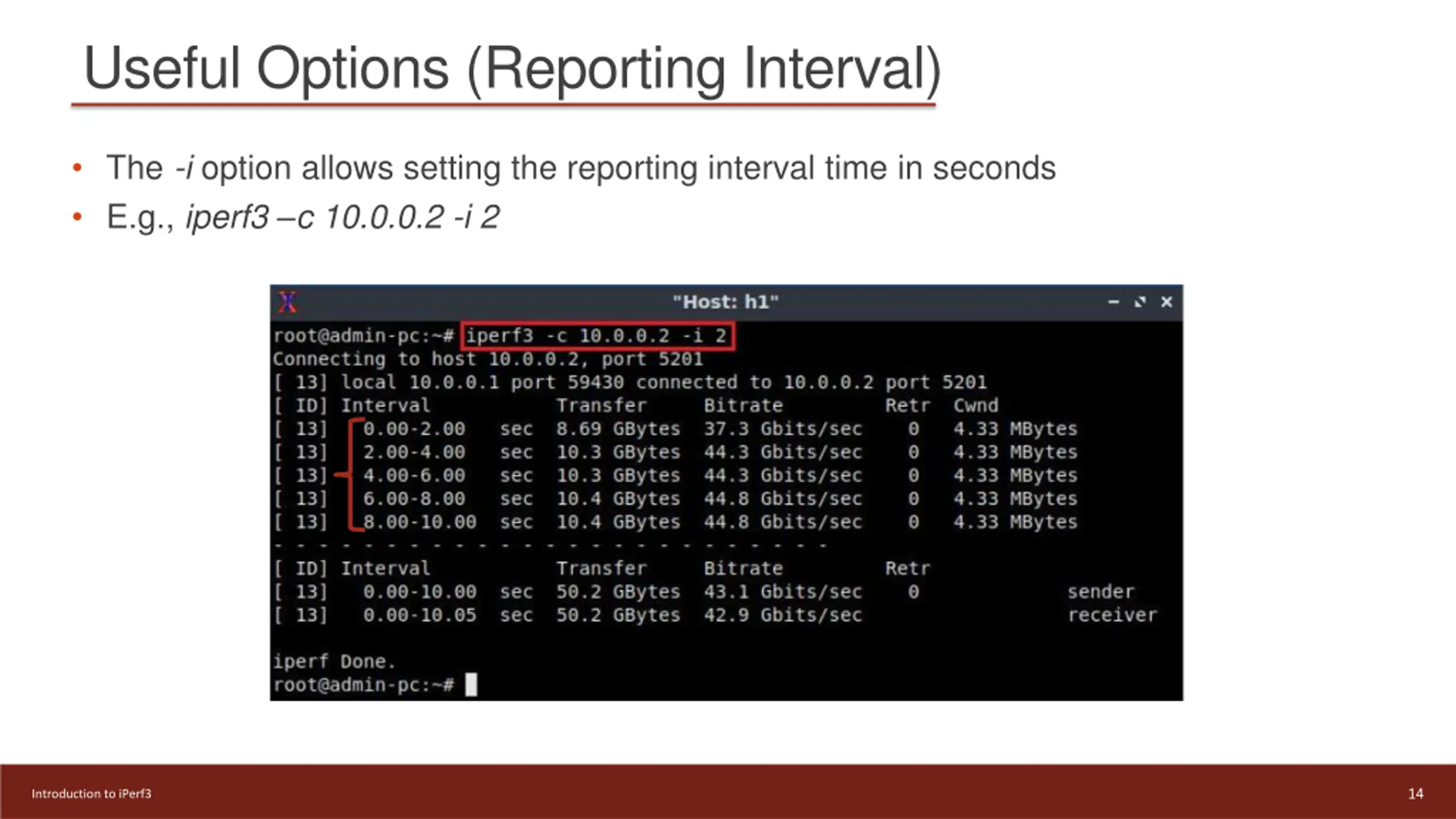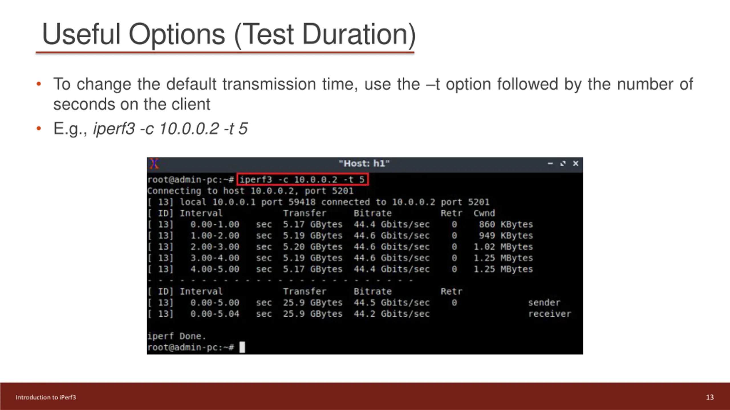 Useful Options (Test Duration) To change the default transmission time, use the t option followed by the number of seconds on the client E.g., iperf3 -c 10.0.0.2 -t 5 13 Introduction to iPerf3