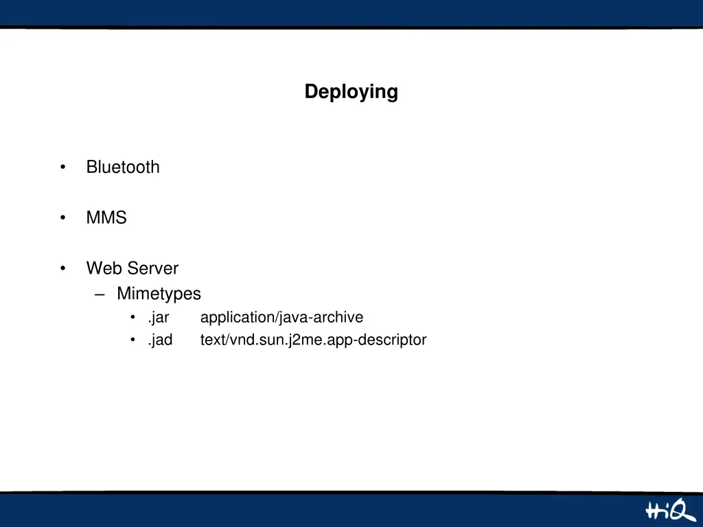 Deploying Bluetooth MMS Web Server Mimetypes .jar .jad application/java-archive text/vnd.sun.j2me.app-descriptor