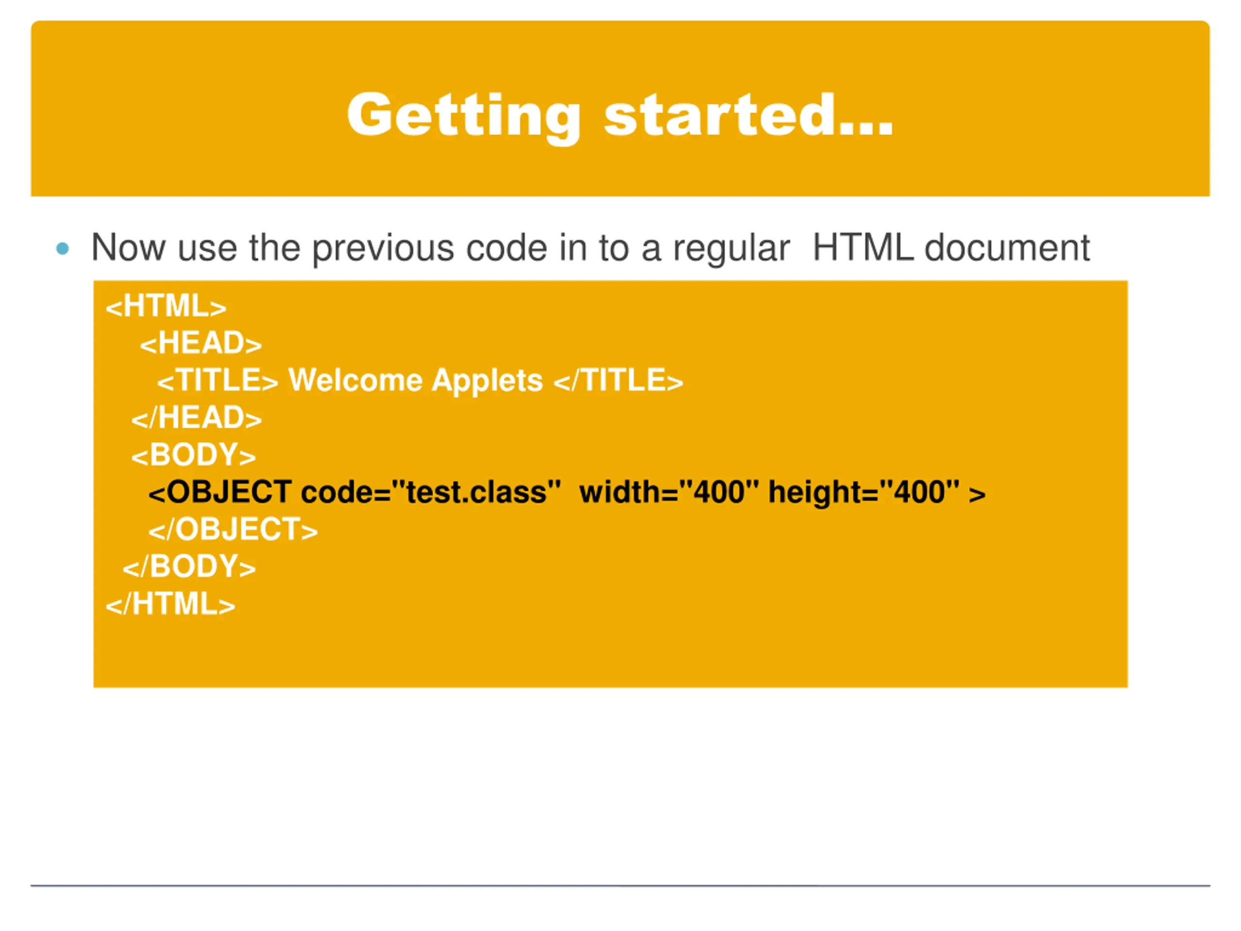 Getting started Now use the previous code in to a regular HTML document <HTML> <HEAD> <TITLE> Welcome Applets </TITLE> </HEAD> <BODY> <OBJECT code="test.class" width="400" height="400" > </OBJECT> </BODY> </HTML>