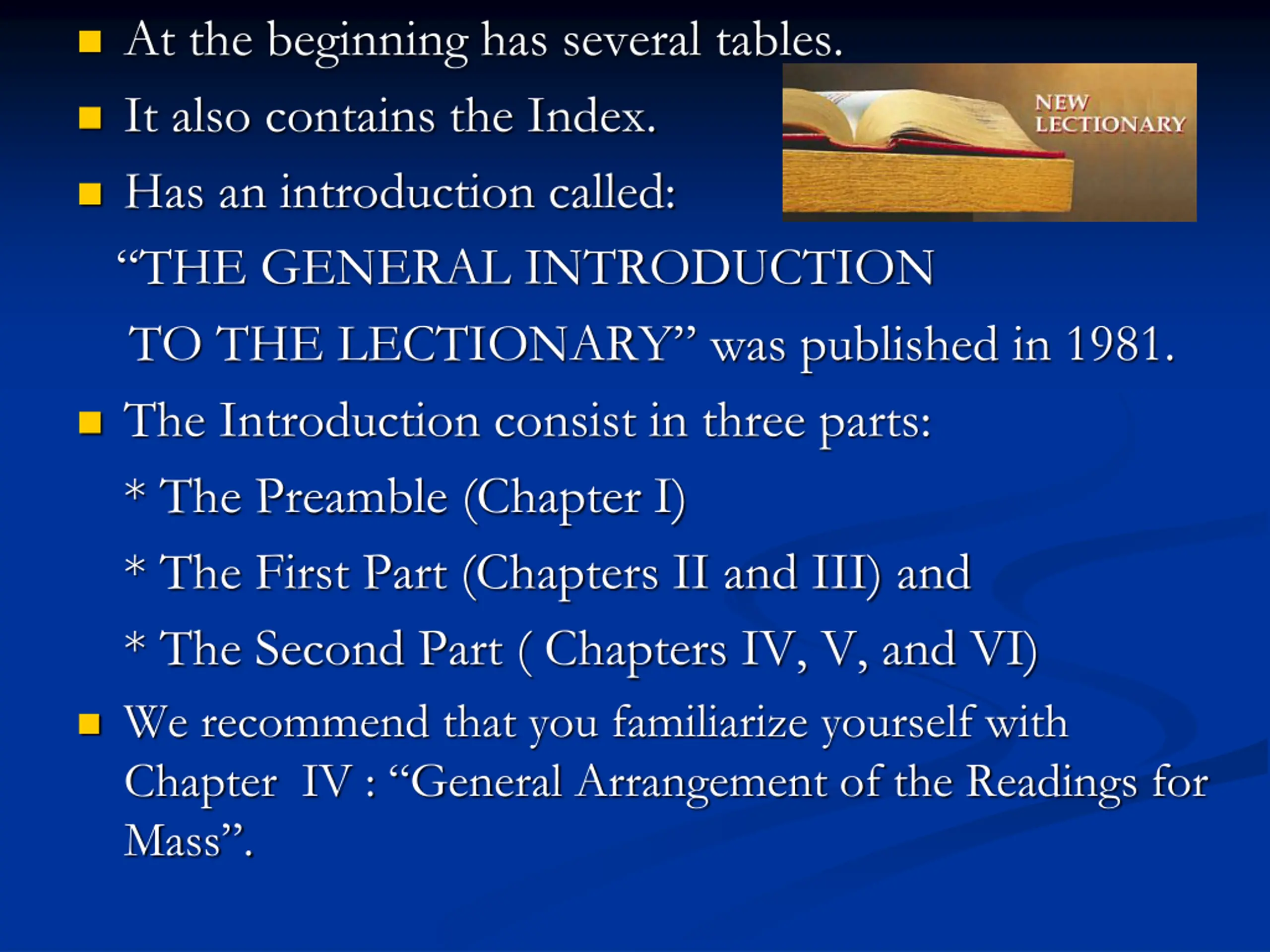 At the beginning has several tables. It also contains the Index. Has an introduction called: THE GENERAL INTRODUCTION TO THE LECTIONARY was published in 1981. The Introduction consist in three parts: * The Preamble (Chapter I) * The First Part (Chapters II and III) and * The Second Part ( Chapters IV, V, and VI) We recommend that you familiarize yourself with Chapter IV : General Arrangement of the Readings for Mass .