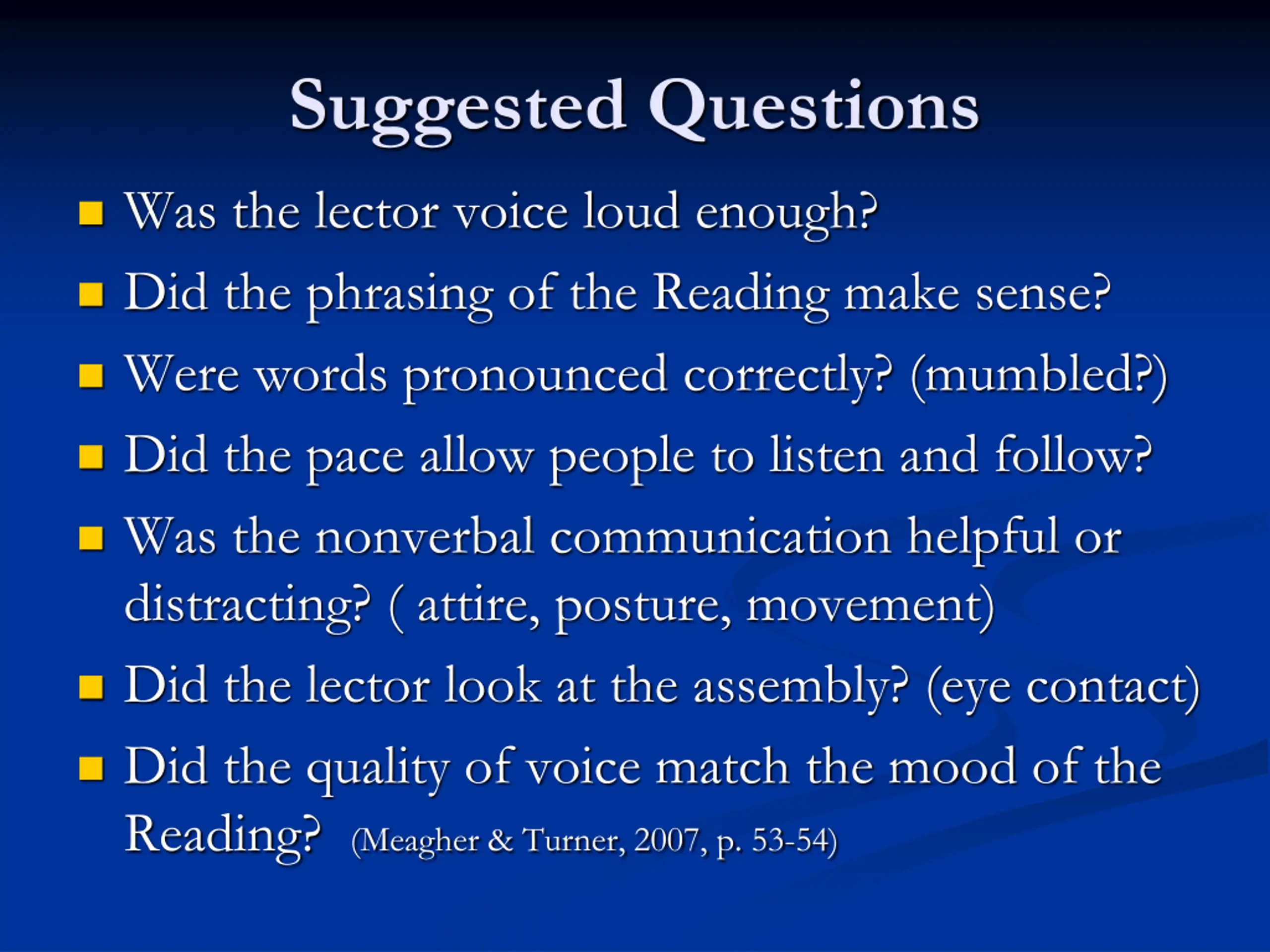 Suggested Questions Was the lector voice loud enough? Did the phrasing of the Reading make sense? Were words pronounced correctly? (mumbled?) Did the pace allow people to listen and follow? Was the nonverbal communication helpful or distracting? ( attire, posture, movement) Did the lector look at the assembly? (eye contact) Did the quality of voice match the mood of the Reading? (Meagher & Turner, 2007, p. 53-54)