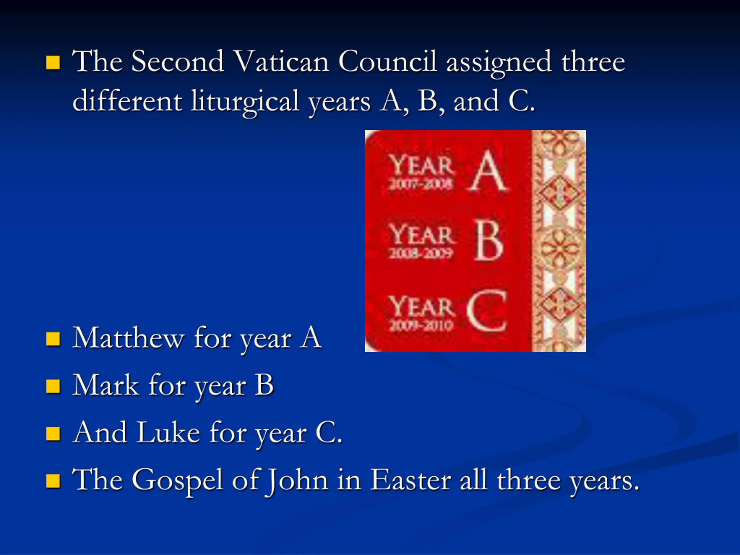 The Second Vatican Council assigned three different liturgical years A, B, and C. Matthew for year A Mark for year B And Luke for year C. The Gospel of John in Easter all three years.