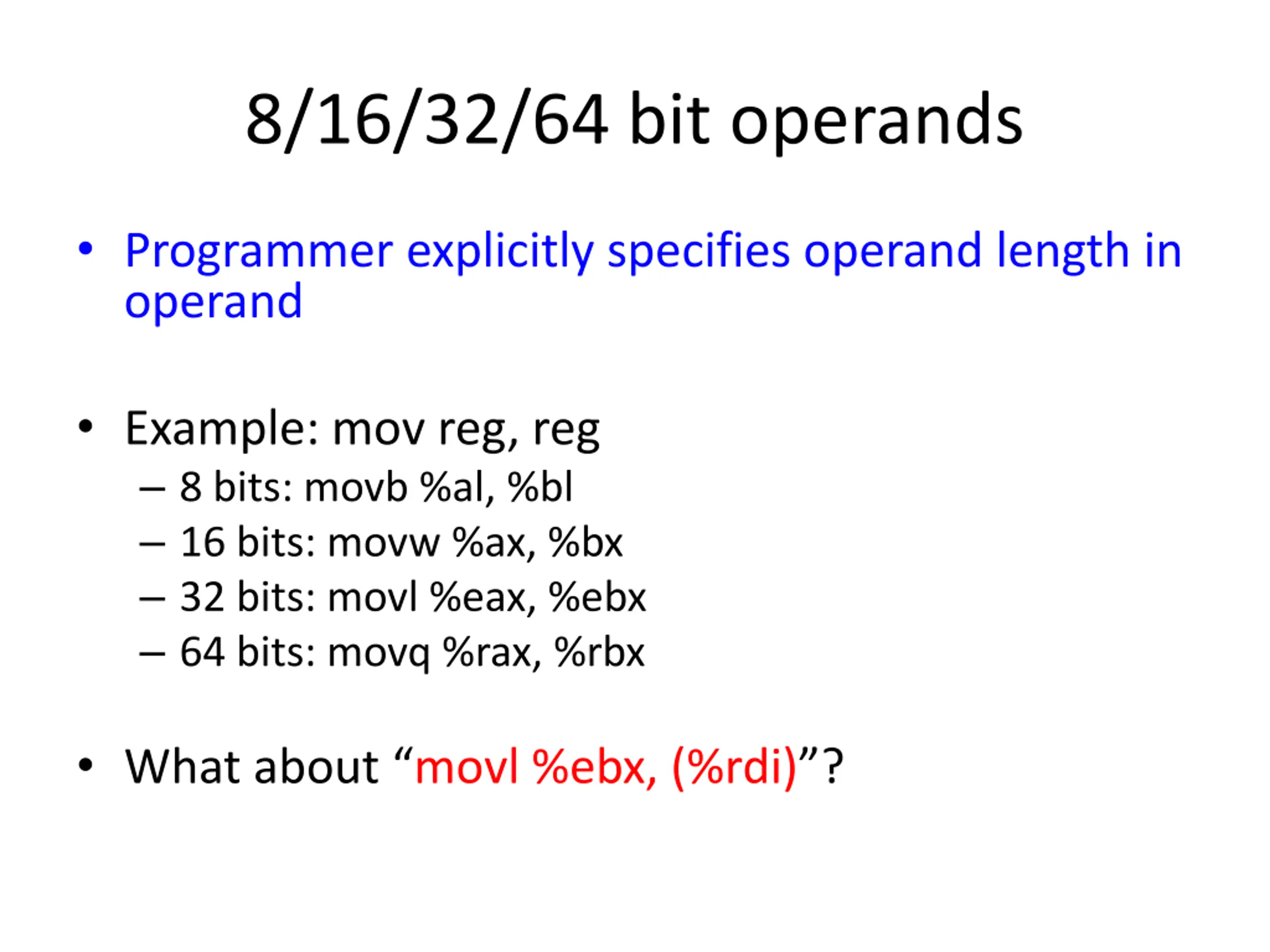 8/16/32/64 bit operands Programmer explicitly specifies operand length in operand Example: mov reg, reg 8 bits: movb %al, %bl 16 bits: movw %ax, %bx 32 bits: movl %eax, %ebx 64 bits: movq %rax, %rbx What about movl %ebx, (%rdi) ?