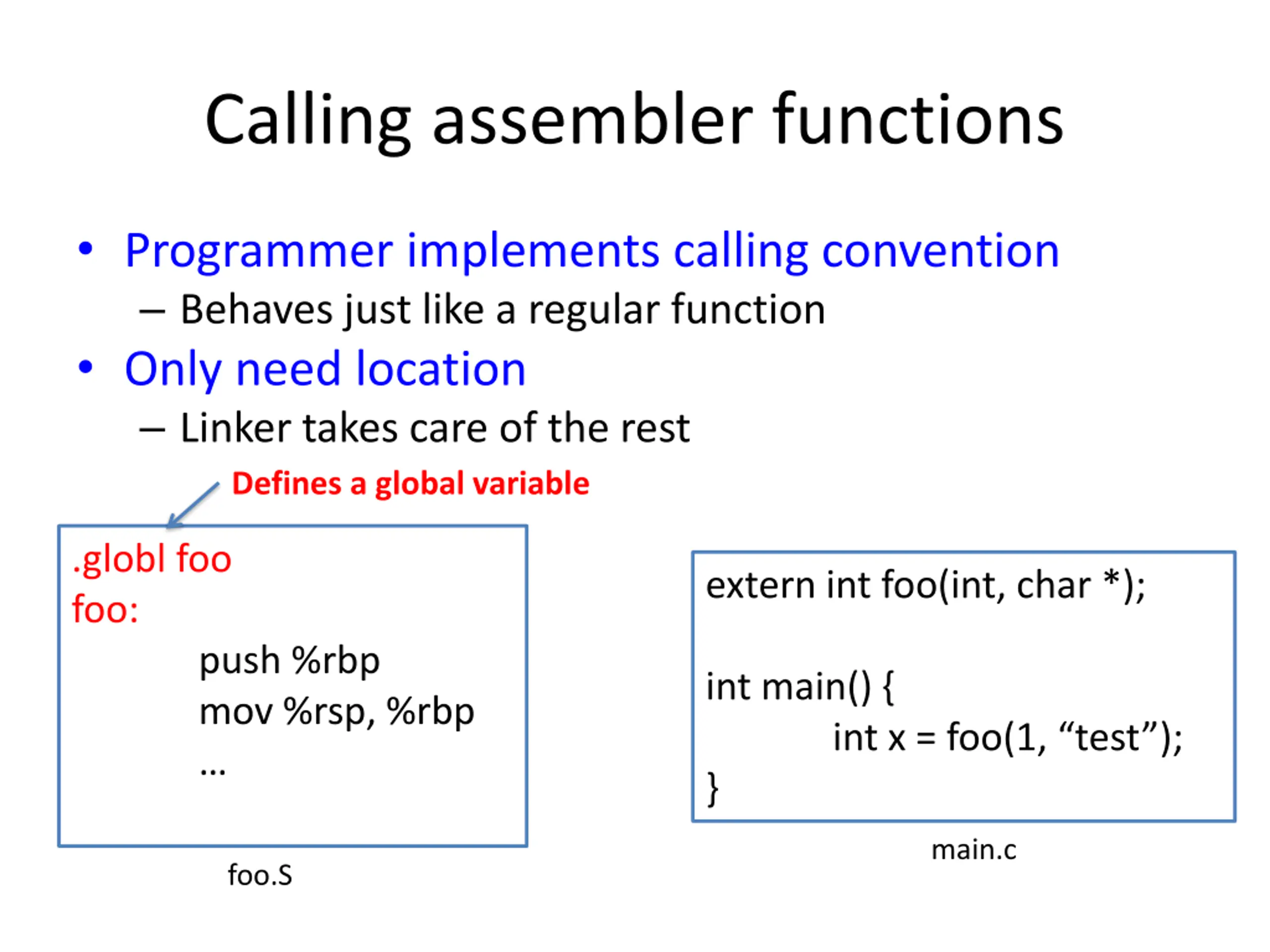 Calling assembler functions Programmer implements calling convention Behaves just like a regular function Only need location Linker takes care of the rest Defines a global variable .globl foo foo: extern int foo(int, char *); push %rbp mov %rsp, %rbp int main() { } int x = foo(1, test ); main.c foo.S