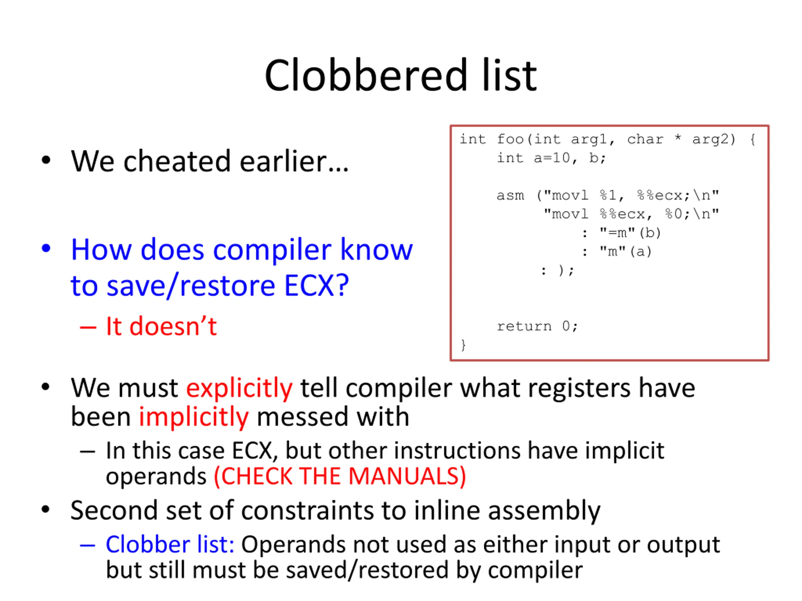 Clobbered list int foo(int arg1, char * arg2) { int a=10, b; We cheated earlier asm ("movl %1, %%ecx;\n" "movl %%ecx, %0;\n" : "=m"(b) : "m"(a) : ); How does compiler know to save/restore ECX? It doesn t return 0; } We must explicitly tell compiler what registers have been implicitly messed with In this case ECX, but other instructions have implicit operands (CHECK THE MANUALS) Second set of constraints to inline assembly Clobber list: Operands not used as either input or output but still must be saved/restored by compiler