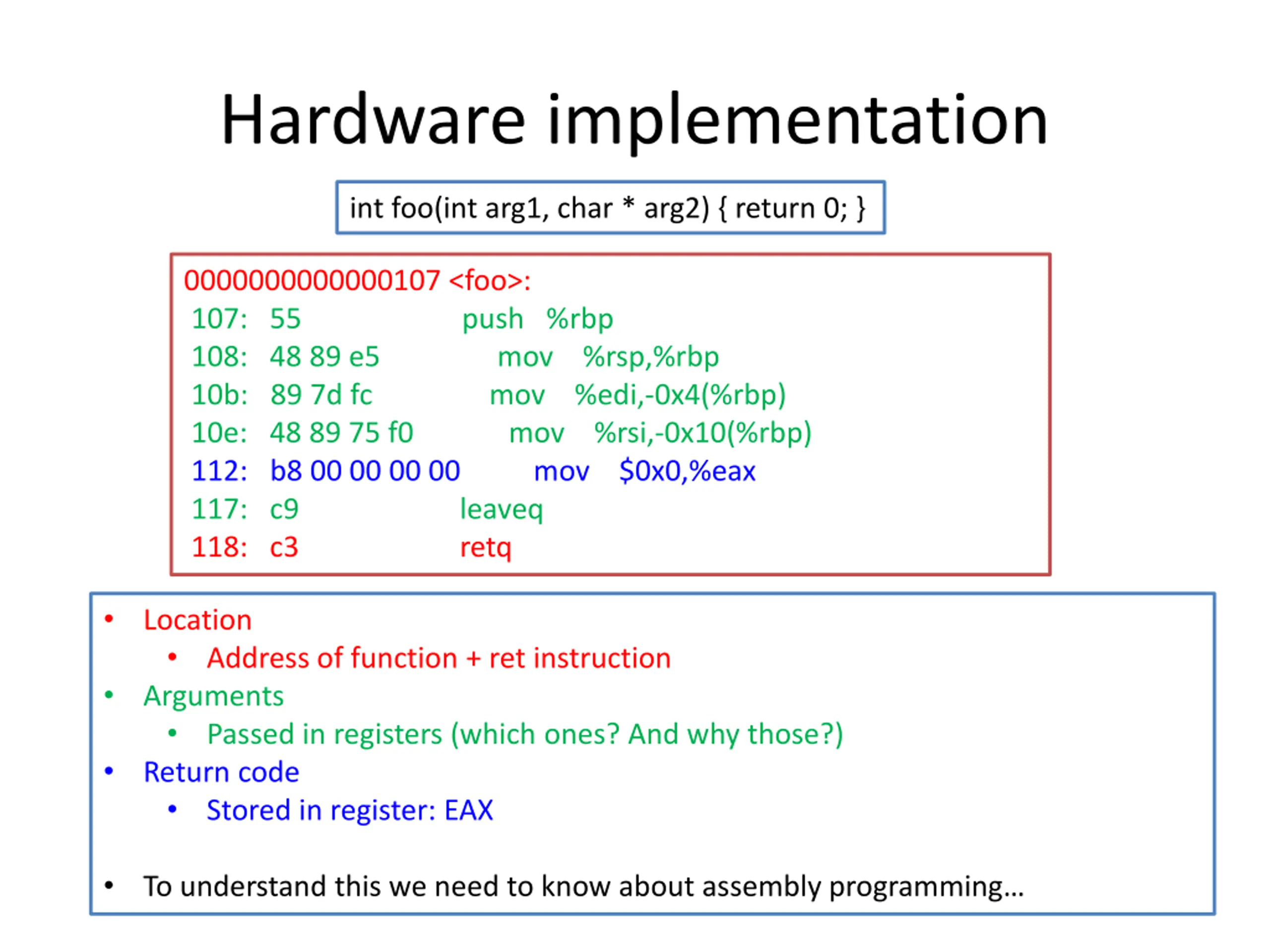 Hardware implementation int foo(int arg1, char * arg2) { return 0; } 0000000000000107 <foo>: 107: 55 push %rbp 108: 48 89 e5 mov %rsp,%rbp 10b: 89 7d fc mov %edi,-0x4(%rbp) 10e: 48 89 75 f0 mov %rsi,-0x10(%rbp) 112: b8 00 00 00 00 mov $0x0,%eax 117: c9 leaveq 118: c3 retq Location Arguments Passed in registers (which ones? And why those?) Return code Stored in register: EAX Address of function + ret instruction To understand this we need to know about assembly programming