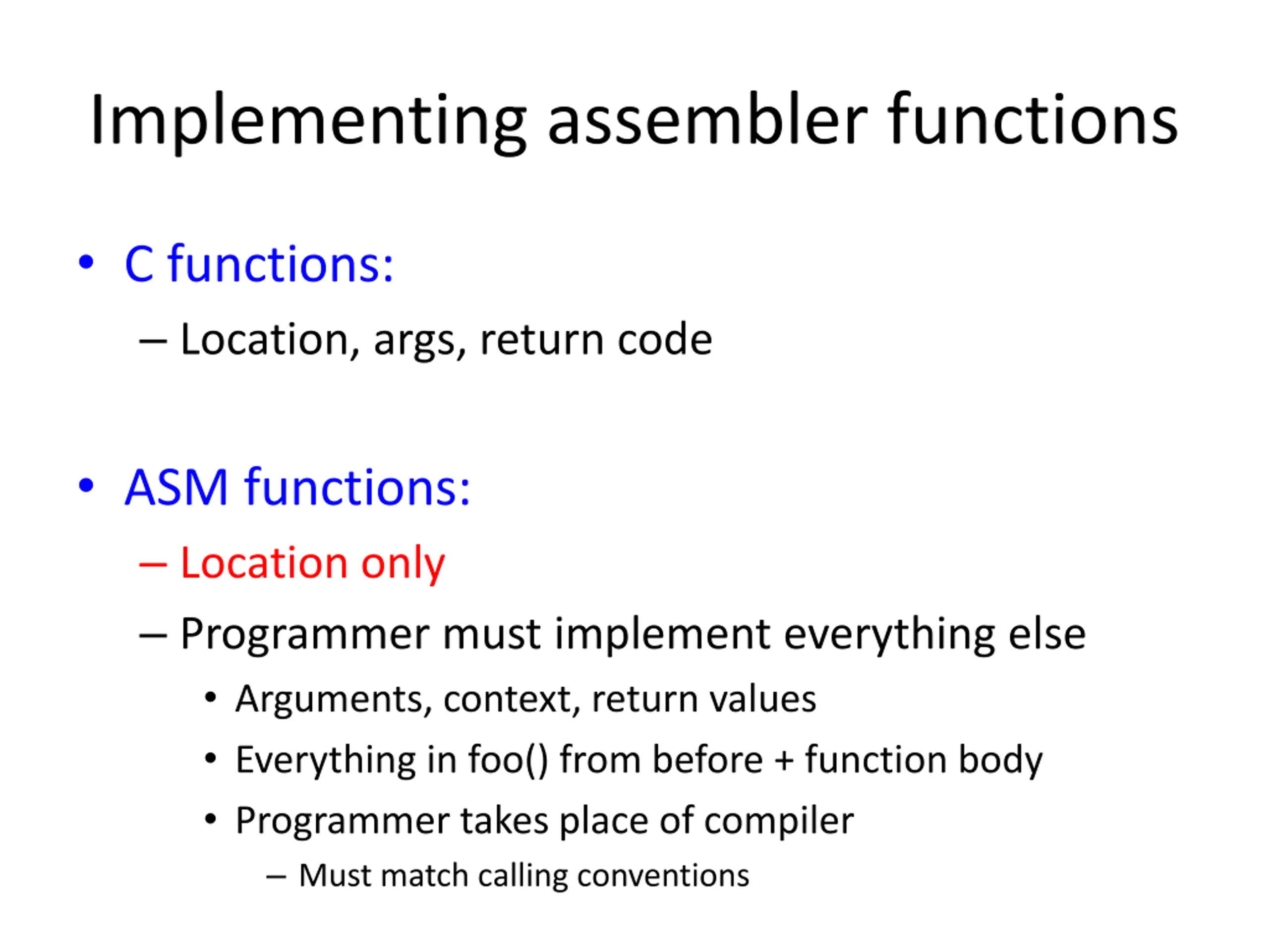 Implementing assembler functions C functions: Location, args, return code ASM functions: Location only Programmer must implement everything else Arguments, context, return values Everything in foo() from before + function body Programmer takes place of compiler Must match calling conventions