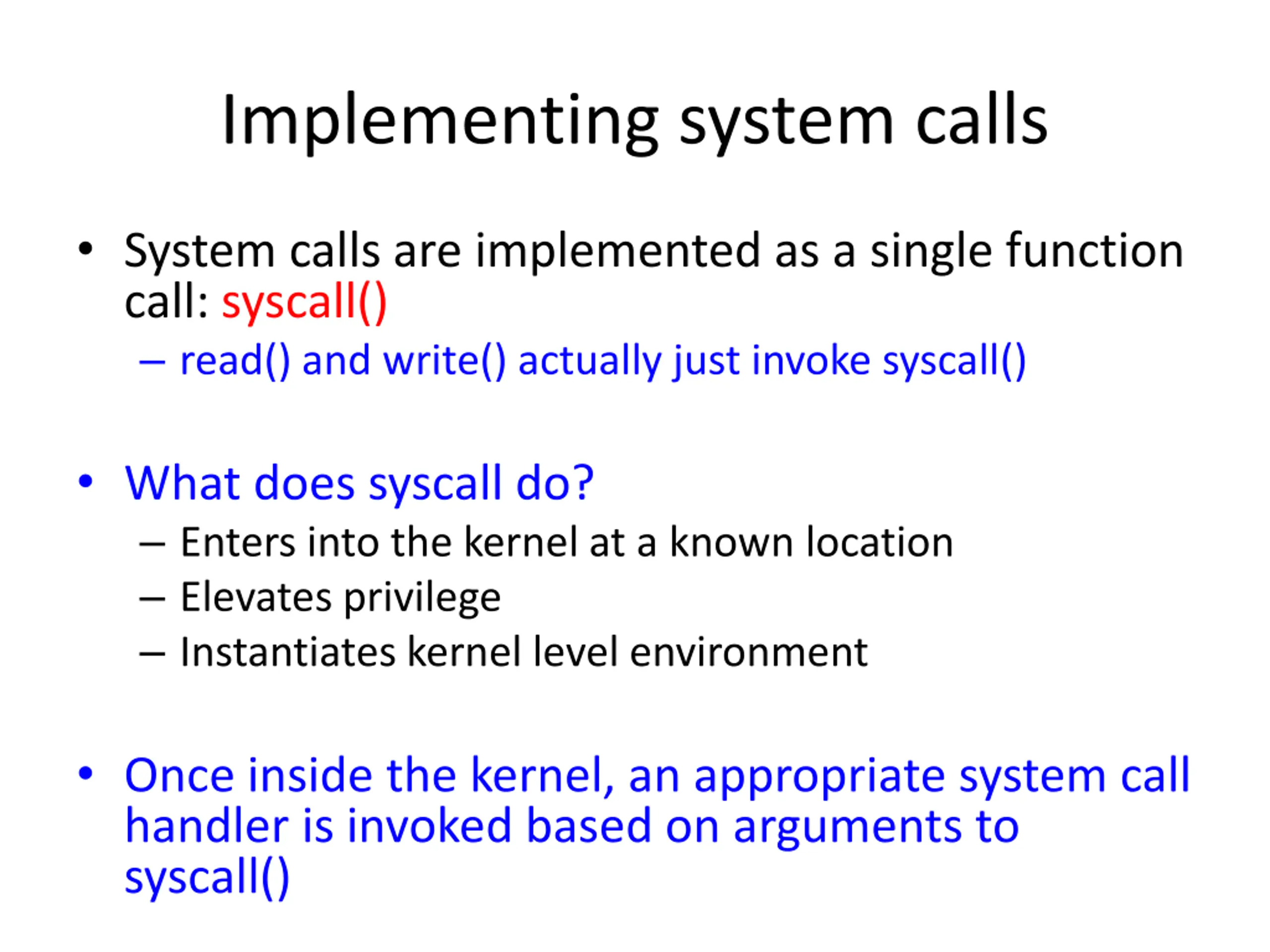Implementing system calls System calls are implemented as a single function call: syscall() read() and write() actually just invoke syscall() What does syscall do? Enters into the kernel at a known location Elevates privilege Instantiates kernel level environment Once inside the kernel, an appropriate system call handler is invoked based on arguments to syscall()