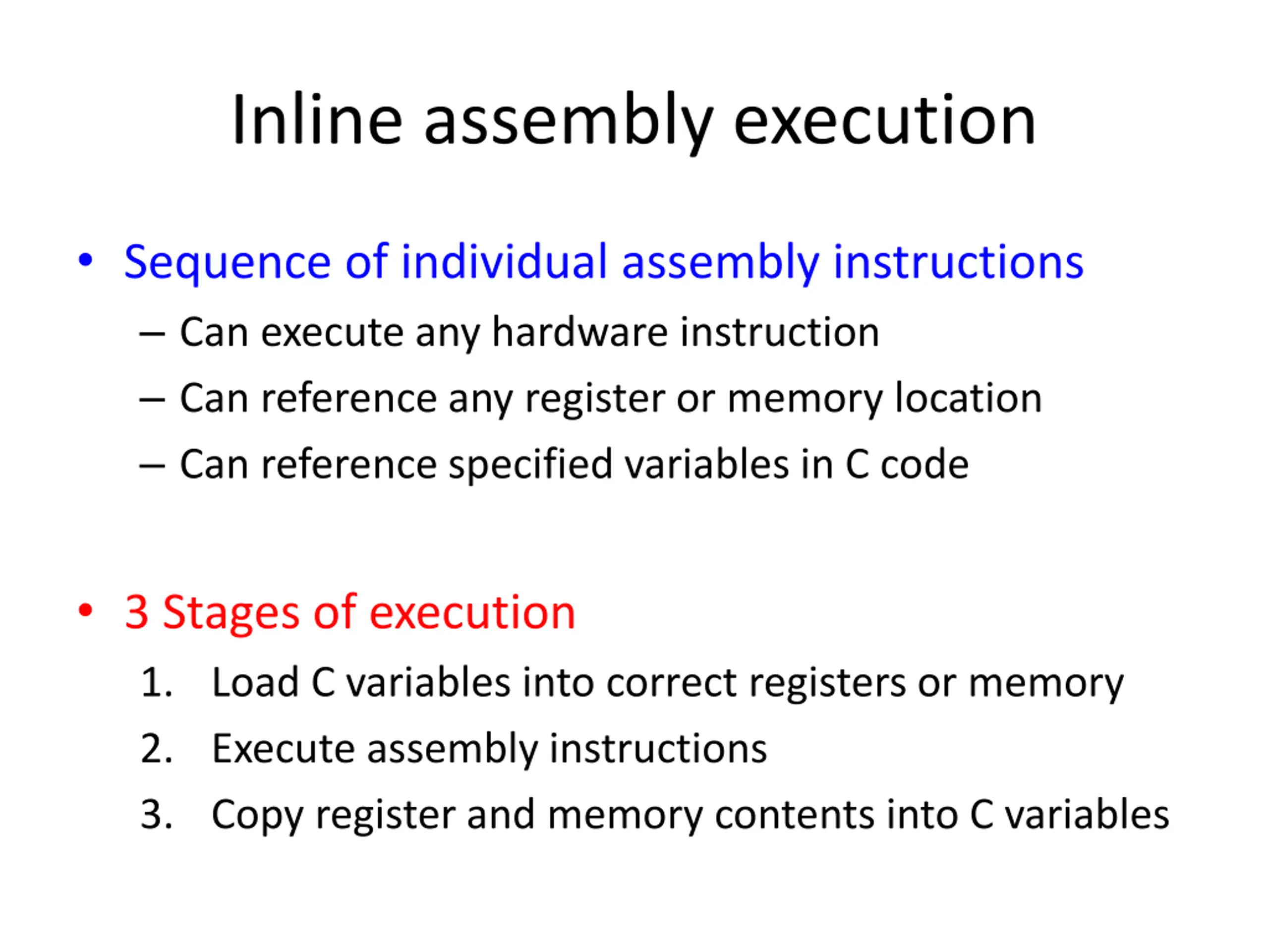 Inline assembly execution Sequence of individual assembly instructions Can execute any hardware instruction Can reference any register or memory location Can reference specified variables in C code 3 Stages of execution 1. Load C variables into correct registers or memory 2. Execute assembly instructions 3. Copy register and memory contents into C variables