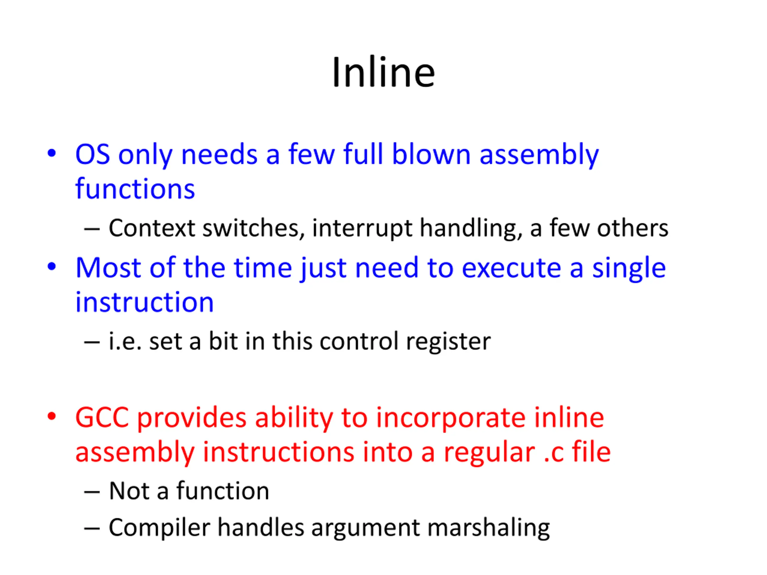 Inline OS only needs a few full blown assembly functions Context switches, interrupt handling, a few others Most of the time just need to execute a single instruction i.e. set a bit in this control register GCC provides ability to incorporate inline assembly instructions into a regular .c file Not a function Compiler handles argument marshaling