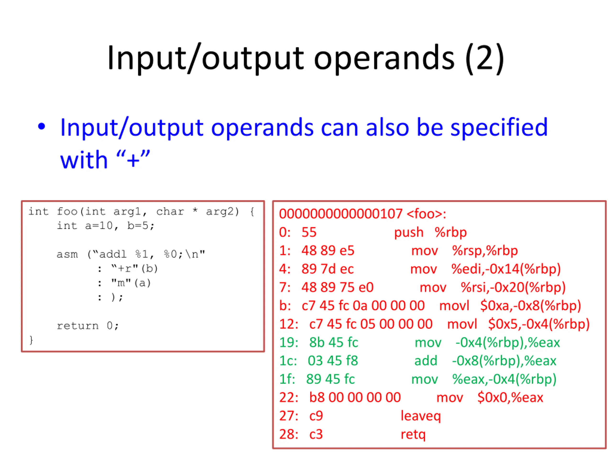 Input/output operands (2) Input/output operands can also be specified with + int foo(int arg1, char * arg2) { int a=10, b=5; 0000000000000107 <foo>: 0: 55 push %rbp 1: 48 89 e5 mov %rsp,%rbp 4: 89 7d ec mov %edi,-0x14(%rbp) 7: 48 89 75 e0 mov %rsi,-0x20(%rbp) b: c7 45 fc 0a 00 00 00 movl $0xa,-0x8(%rbp) 12: c7 45 fc 05 00 00 00 movl $0x5,-0x4(%rbp) 19: 8b 45 fc mov -0x4(%rbp),%eax 1c: 03 45 f8 add -0x8(%rbp),%eax 1f: 89 45 fc mov %eax,-0x4(%rbp) 22: b8 00 00 00 00 mov $0x0,%eax 27: c9 leaveq 28: c3 retq asm ( addl %1, %0;\n" : +r"(b) : "m"(a) : ); return 0; }