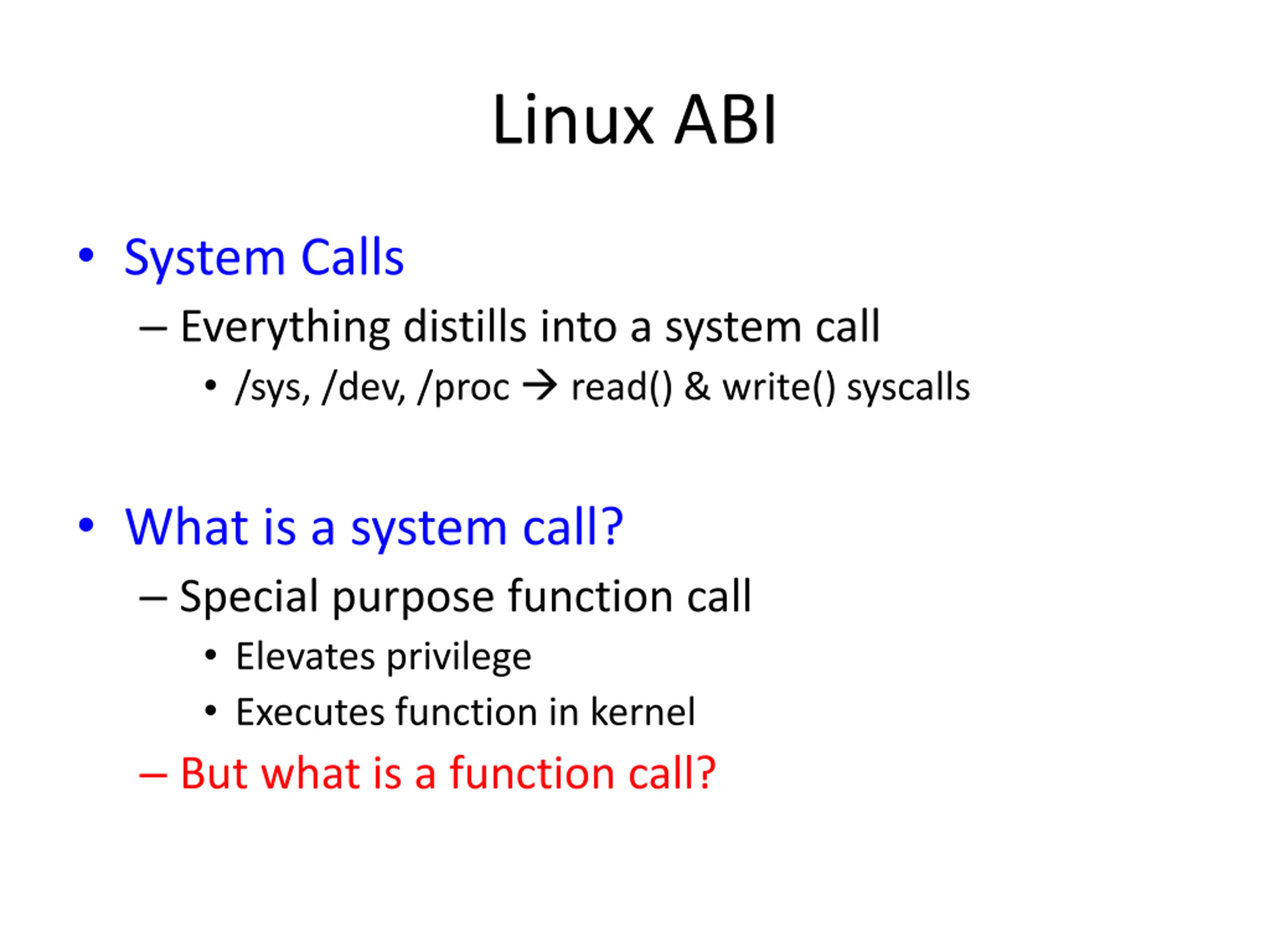 Linux ABI System Calls Everything distills into a system call /sys, /dev, /proc read() & write() syscalls What is a system call? Special purpose function call Elevates privilege Executes function in kernel But what is a function call?
