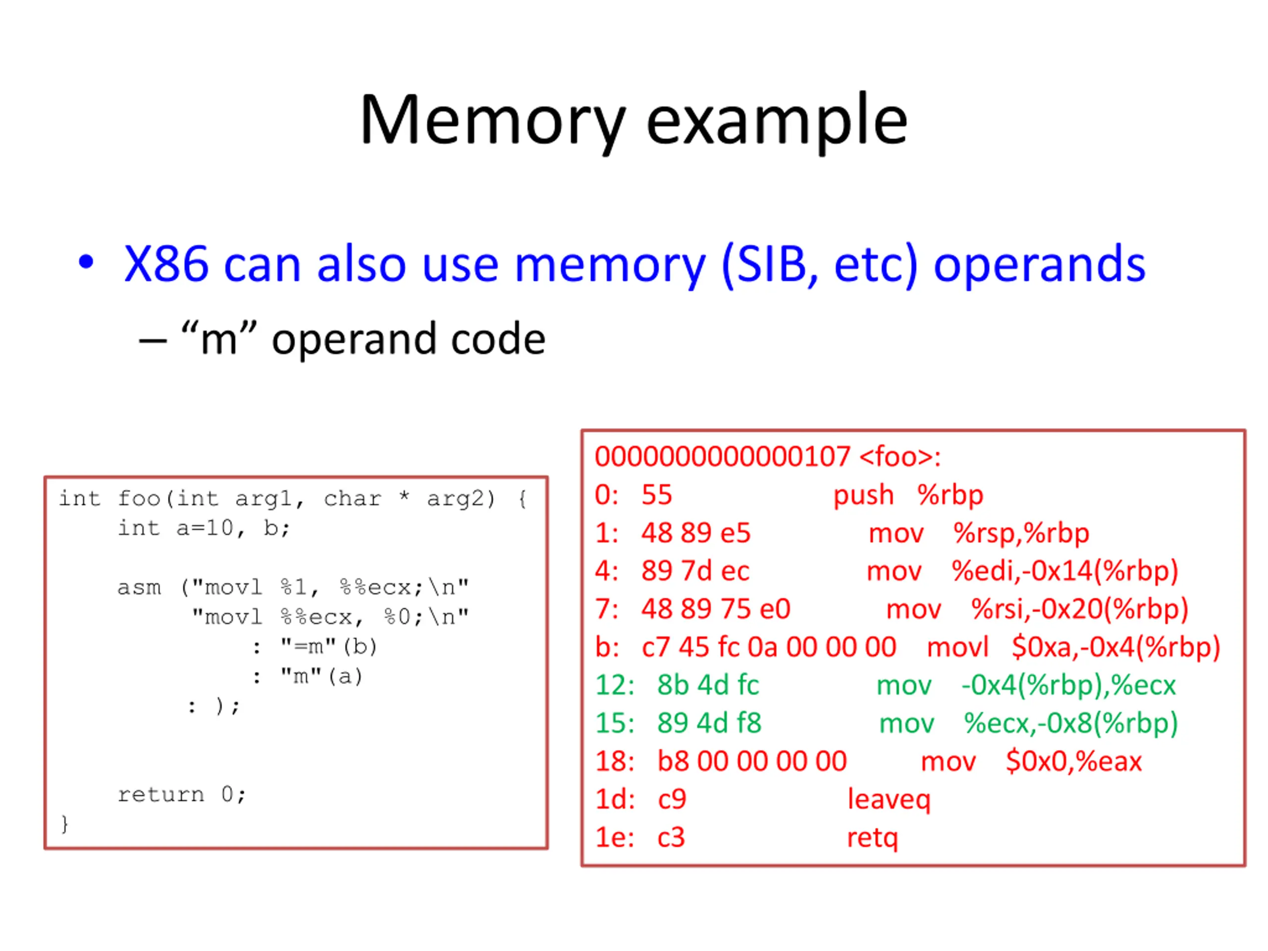 Memory example X86 can also use memory (SIB, etc) operands m operand code 0000000000000107 <foo>: 0: 55 push %rbp 1: 48 89 e5 mov %rsp,%rbp 4: 89 7d ec mov %edi,-0x14(%rbp) 7: 48 89 75 e0 mov %rsi,-0x20(%rbp) b: c7 45 fc 0a 00 00 00 movl $0xa,-0x4(%rbp) 12: 8b 4d fc mov -0x4(%rbp),%ecx 15: 89 4d f8 mov %ecx,-0x8(%rbp) 18: b8 00 00 00 00 mov $0x0,%eax 1d: c9 leaveq 1e: c3 retq int foo(int arg1, char * arg2) { int a=10, b; asm ("movl %1, %%ecx;\n" "movl %%ecx, %0;\n" : "=m"(b) : "m"(a) : ); return 0; }