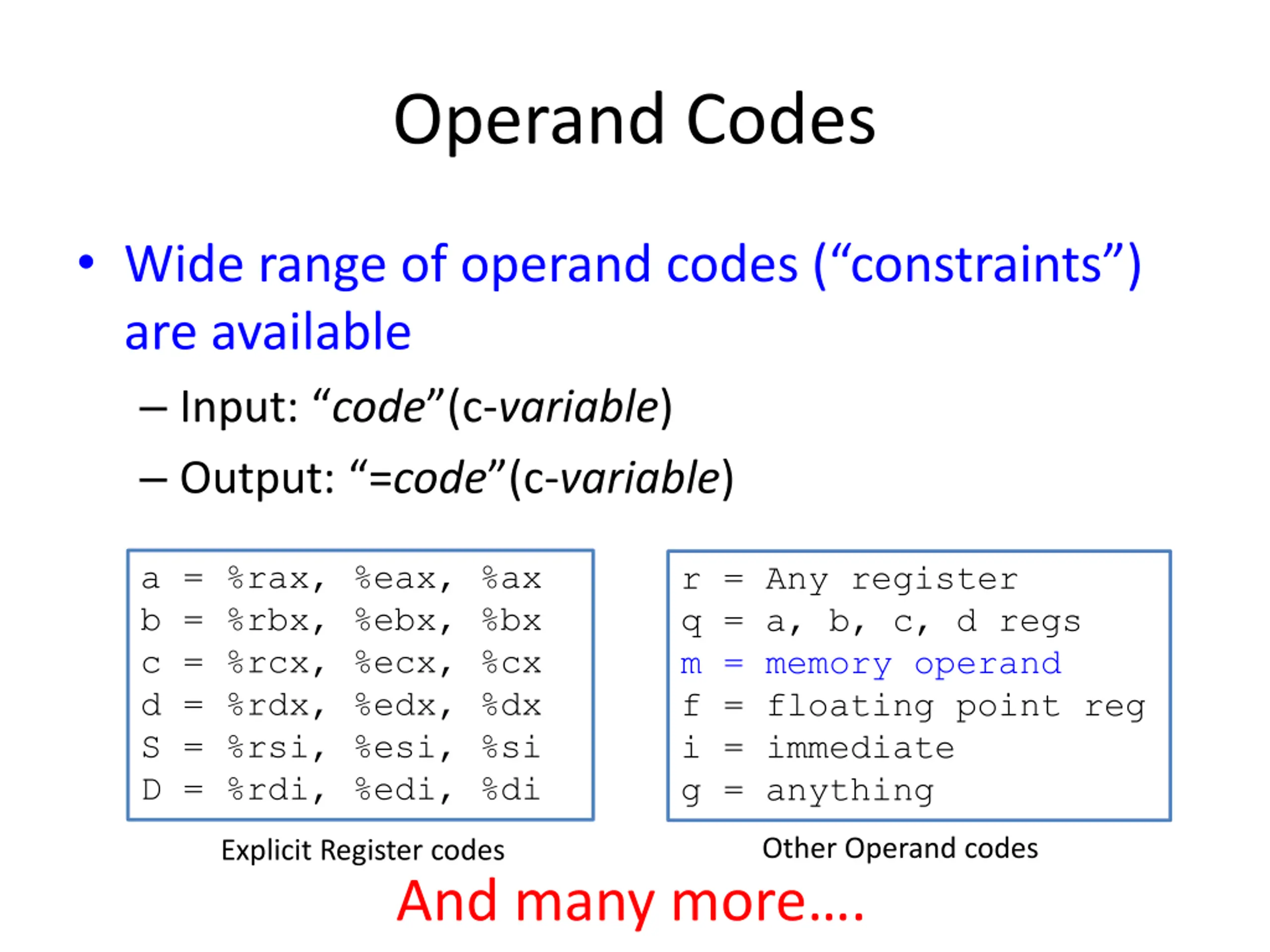 Operand Codes Wide range of operand codes ( constraints ) are available Input: code (c-variable) Output: =code (c-variable) a = %rax, %eax, %ax b = %rbx, %ebx, %bx c = %rcx, %ecx, %cx d = %rdx, %edx, %dx S = %rsi, %esi, %si D = %rdi, %edi, %di r = Any register q = a, b, c, d regs m = memory operand f = floating point reg i = immediate g = anything Other Operand codes Explicit Register codes And many more .