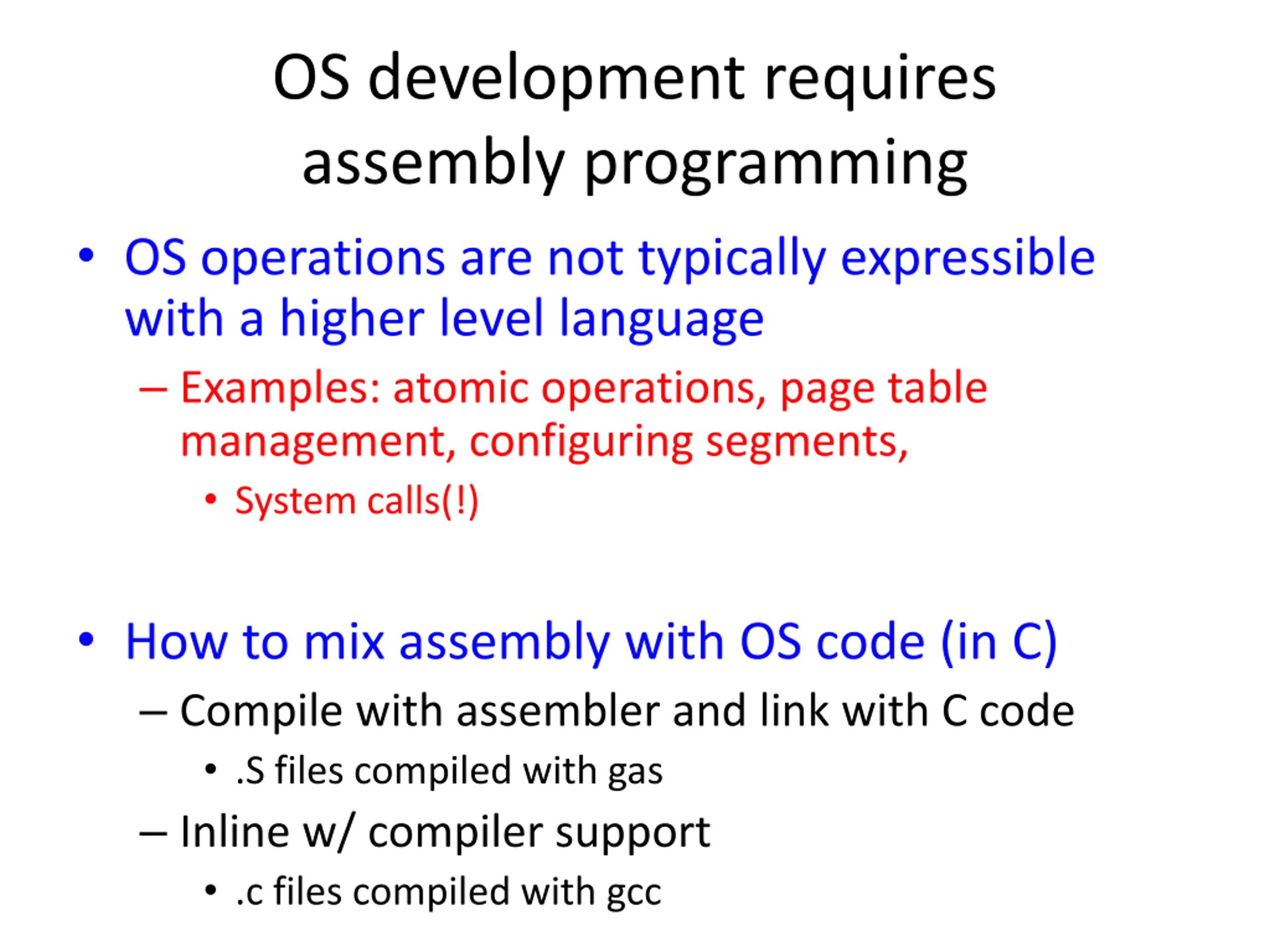 OS development requires assembly programming OS operations are not typically expressible with a higher level language Examples: atomic operations, page table management, configuring segments, System calls(!) How to mix assembly with OS code (in C) Compile with assembler and link with C code .S files compiled with gas Inline w/ compiler support .c files compiled with gcc