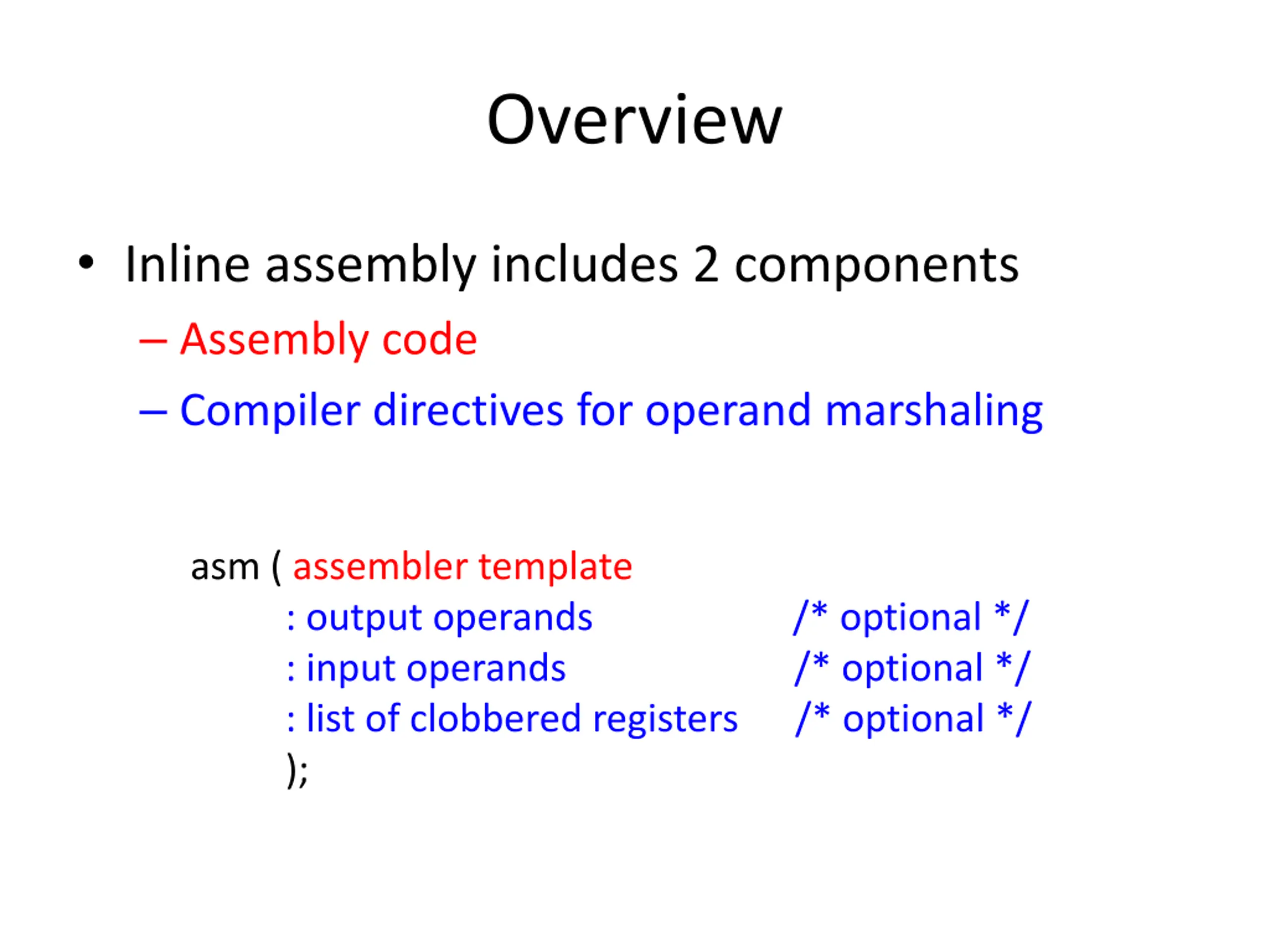Overview Inline assembly includes 2 components Assembly code Compiler directives for operand marshaling asm ( assembler template : output operands /* optional */ : input operands : list of clobbered registers /* optional */ ); /* optional */