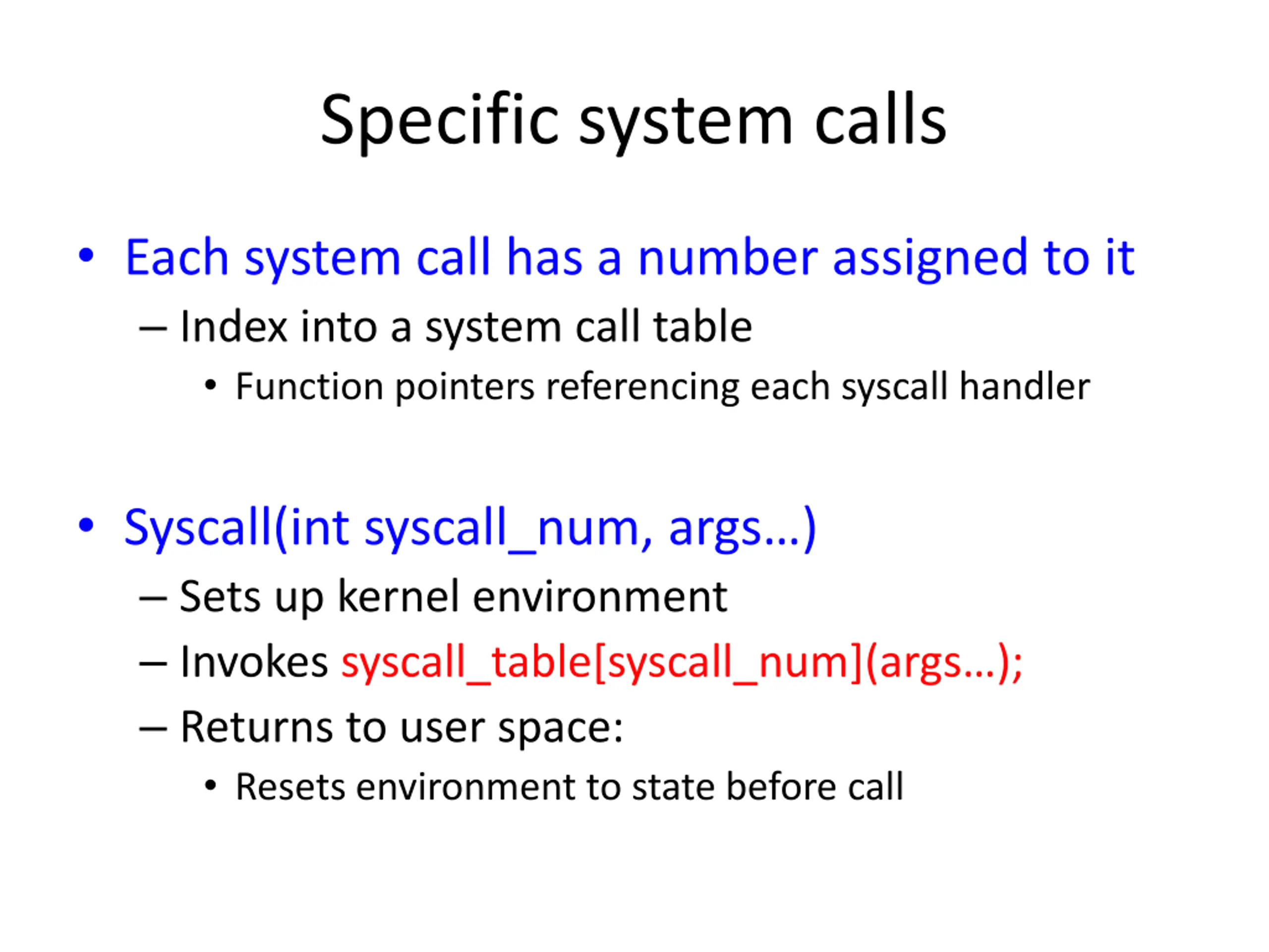 Specific system calls Each system call has a number assigned to it Index into a system call table Function pointers referencing each syscall handler Syscall(int syscall_num, args ) Sets up kernel environment Invokes syscall_table[syscall_num](args ); Returns to user space: Resets environment to state before call