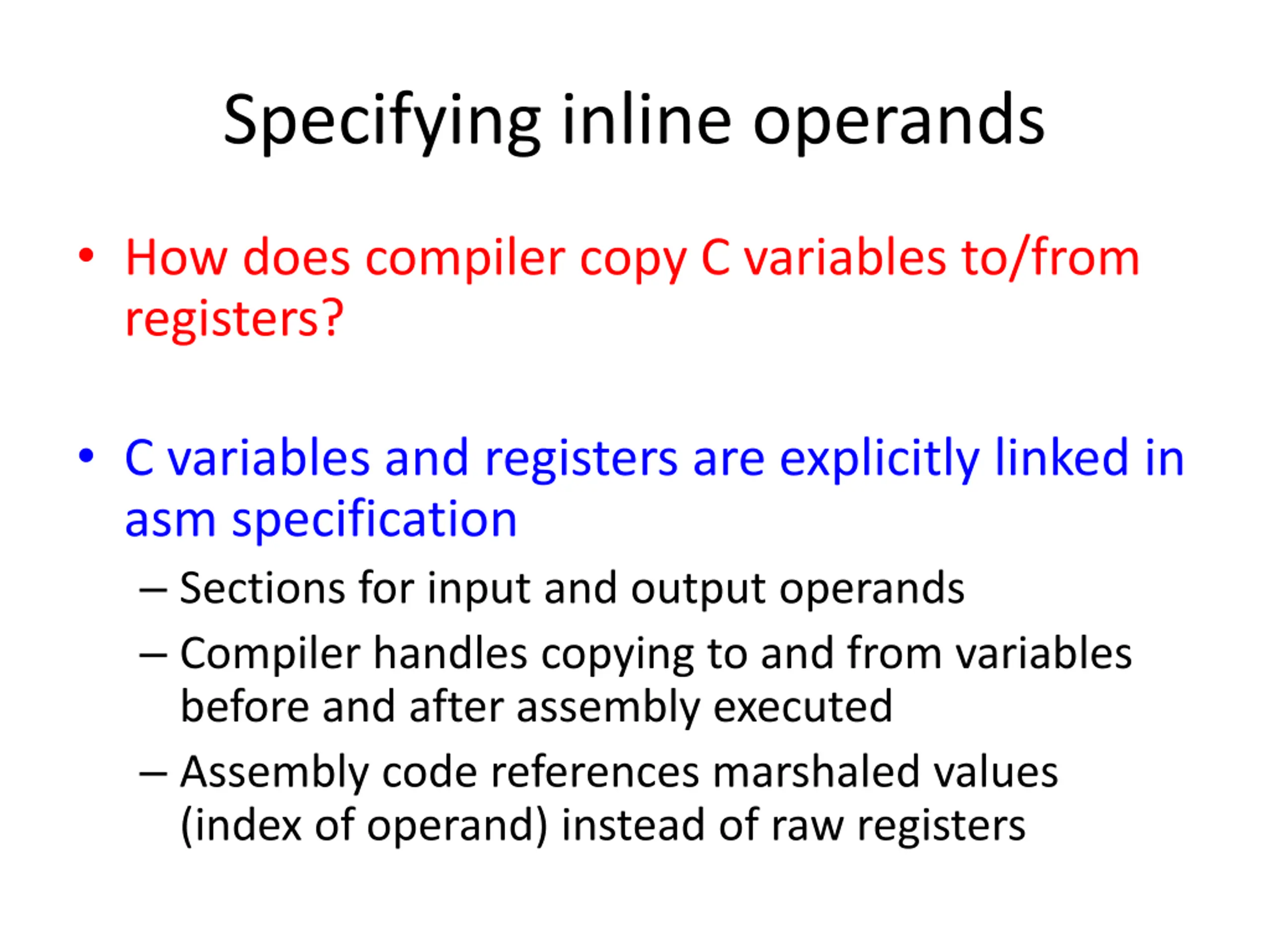 Specifying inline operands How does compiler copy C variables to/from registers? C variables and registers are explicitly linked in asm specification Sections for input and output operands Compiler handles copying to and from variables before and after assembly executed Assembly code references marshaled values (index of operand) instead of raw registers