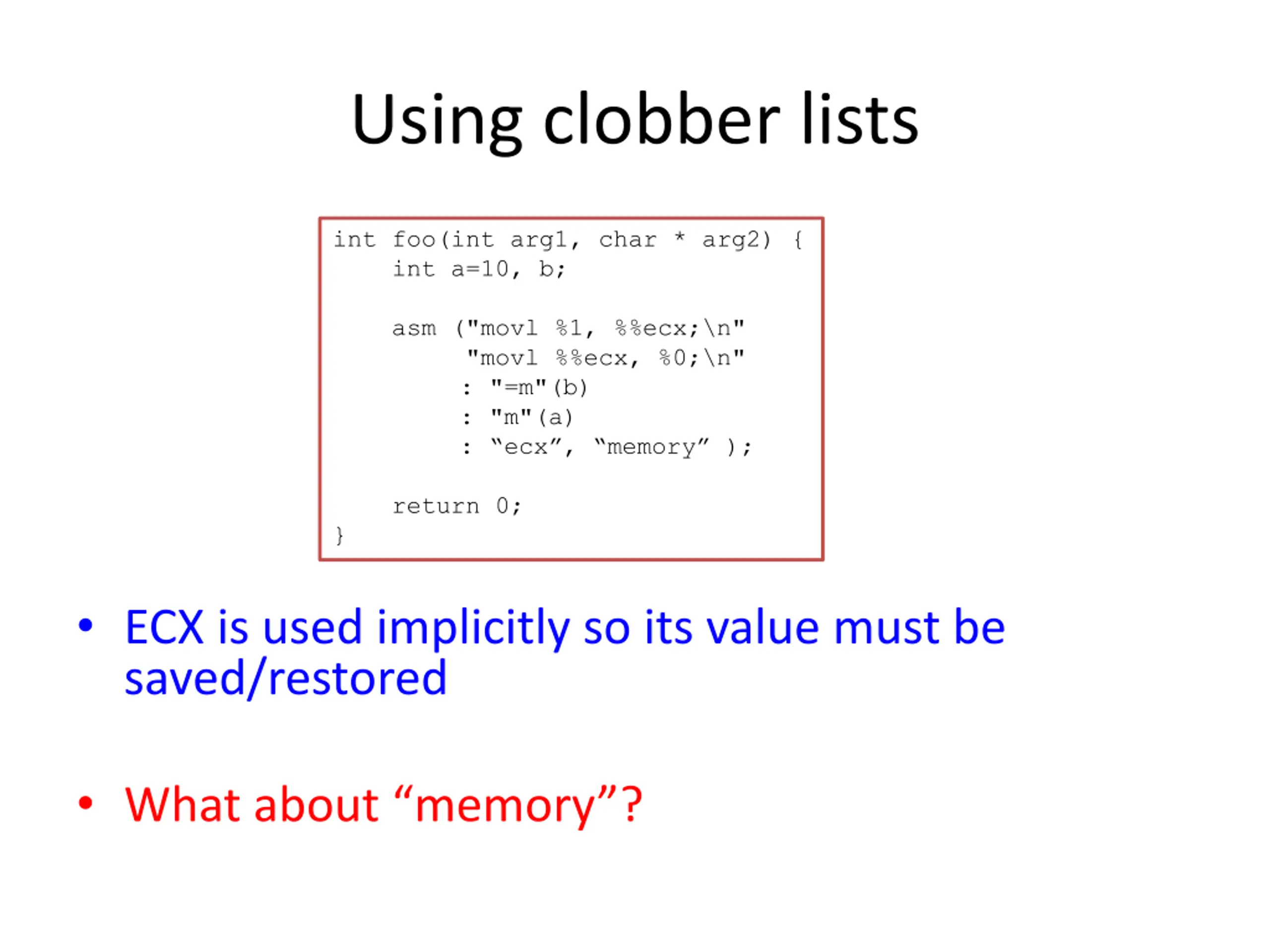 Using clobber lists int foo(int arg1, char * arg2) { int a=10, b; asm ("movl %1, %%ecx;\n" "movl %%ecx, %0;\n" : "=m"(b) : "m"(a) : ecx , memory ); return 0; } ECX is used implicitly so its value must be saved/restored What about memory ?