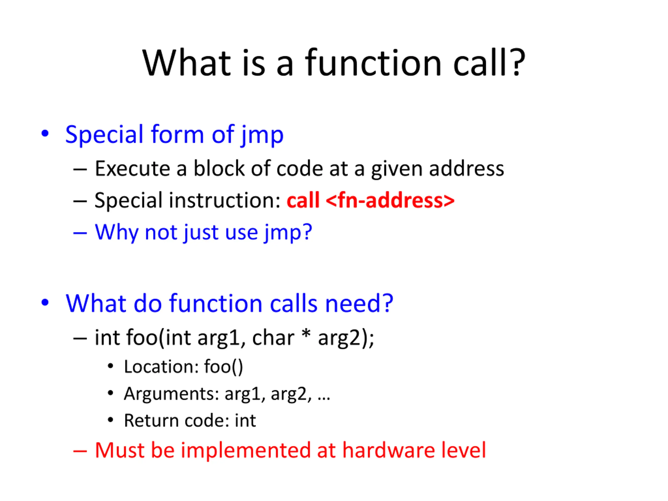 What is a function call? Special form of jmp Execute a block of code at a given address Special instruction: call <fn-address> Why not just use jmp? What do function calls need? int foo(int arg1, char * arg2); Location: foo() Arguments: arg1, arg2, Return code: int Must be implemented at hardware level