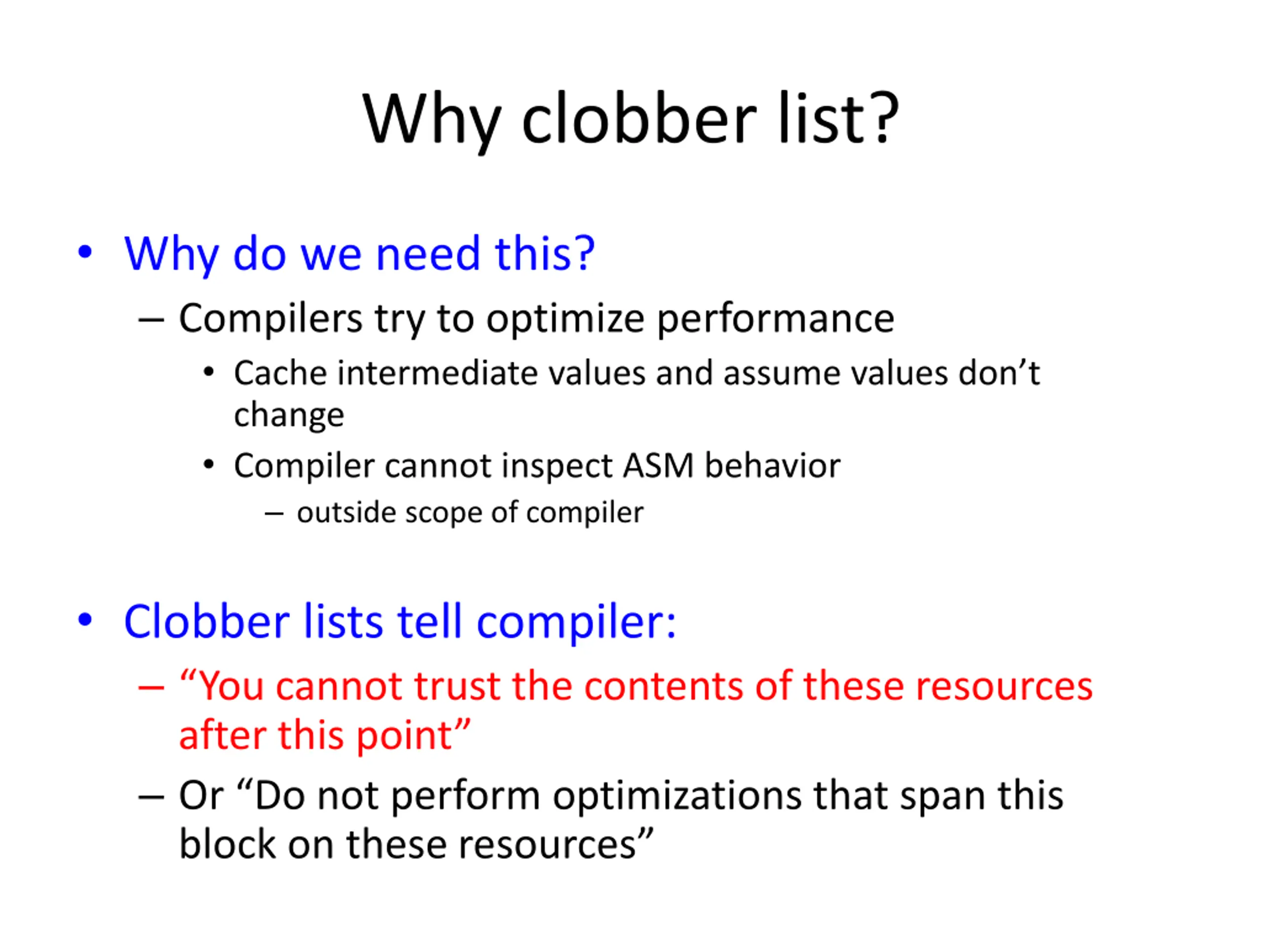 Why clobber list? Why do we need this? Compilers try to optimize performance Cache intermediate values and assume values don t change Compiler cannot inspect ASM behavior outside scope of compiler Clobber lists tell compiler: You cannot trust the contents of these resources after this point Or Do not perform optimizations that span this block on these resources