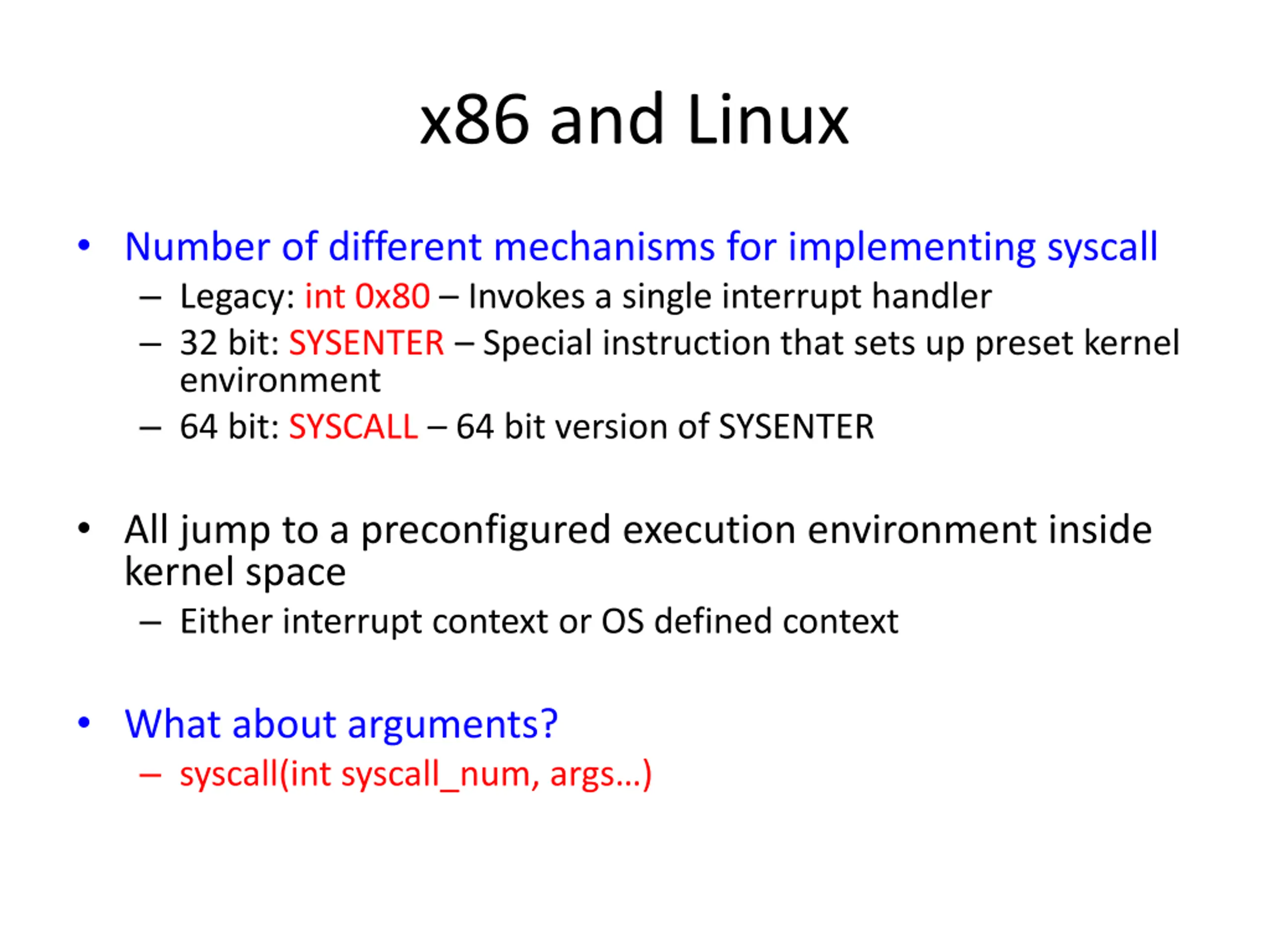 x86 and Linux Number of different mechanisms for implementing syscall Legacy: int 0x80 Invokes a single interrupt handler 32 bit: SYSENTER Special instruction that sets up preset kernel environment 64 bit: SYSCALL 64 bit version of SYSENTER All jump to a preconfigured execution environment inside kernel space Either interrupt context or OS defined context What about arguments? syscall(int syscall_num, args )