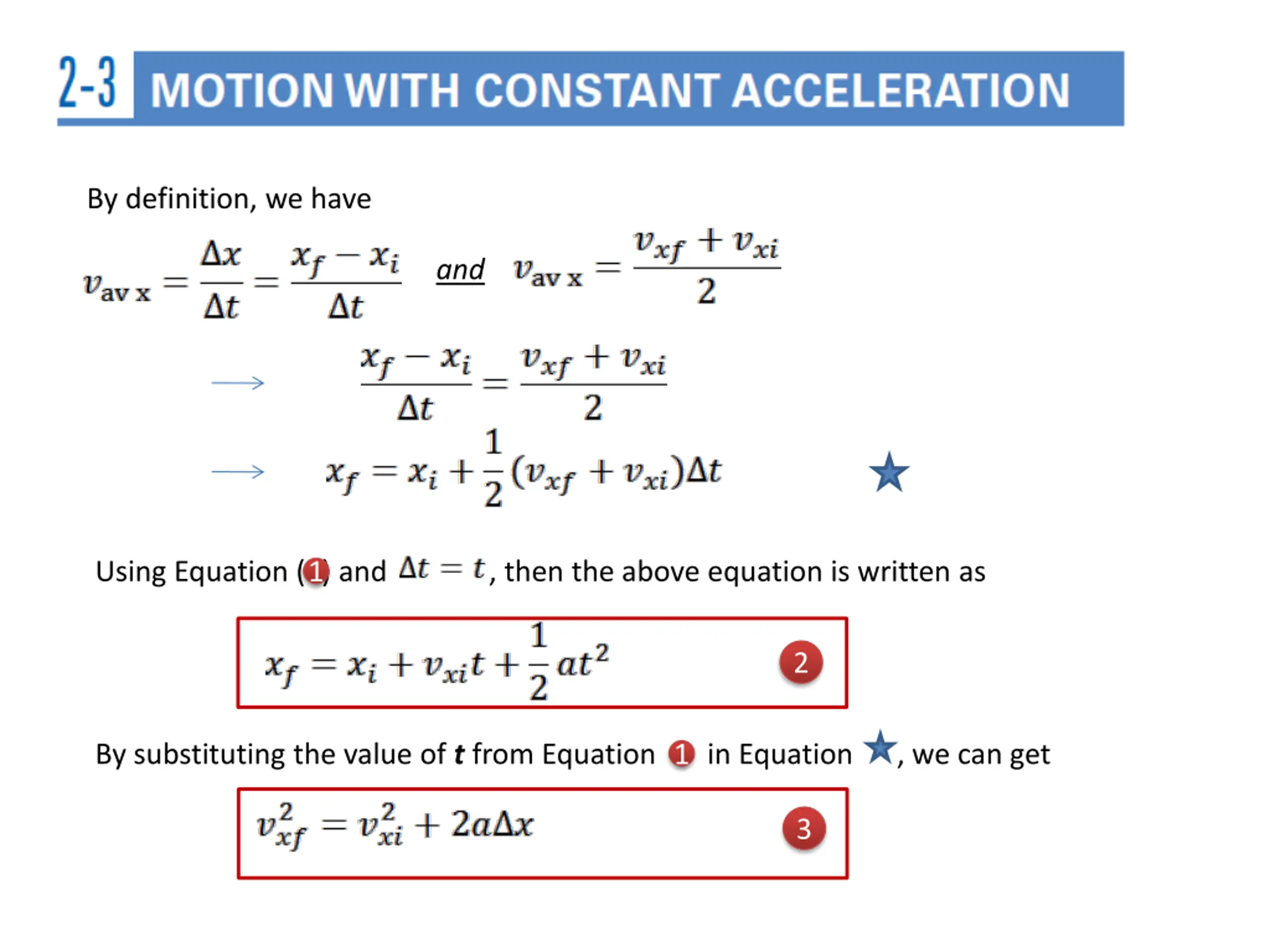 Constant Acceleration The gravity is an example of constant acceleration. ( ) In case of a constant acceleration, the average acceleration is also constant and has the same value. That is Kinematic Equations (3 Equations) Recall but Suppose , then , and the above equation can be written as 1