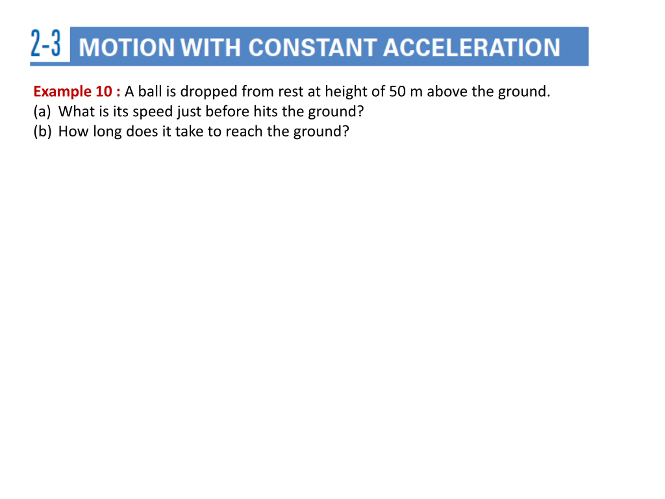 Example 10 : A ball is dropped from rest at height of 50 m above the ground. (a) What is its speed just before hits the ground? (b) How long does it take to reach the ground?