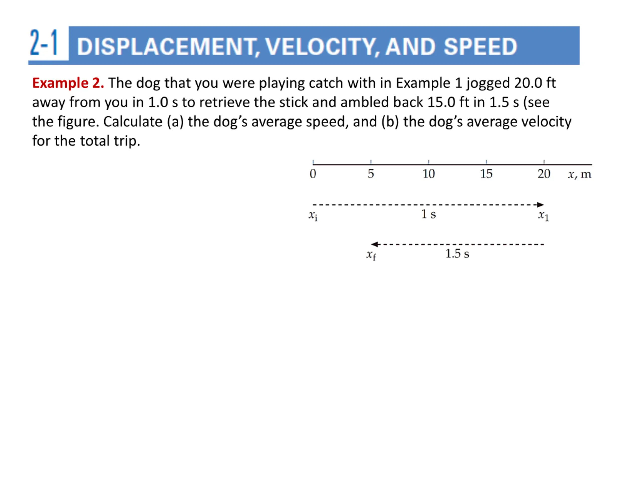 Example 2. The dog that you were playing catch with in Example 1 jogged 20.0 ft away from you in 1.0 s to retrieve the stick and ambled back 15.0 ft in 1.5 s (see the figure. Calculate (a) the dog s average speed, and (b) the dog s average velocity for the total trip.