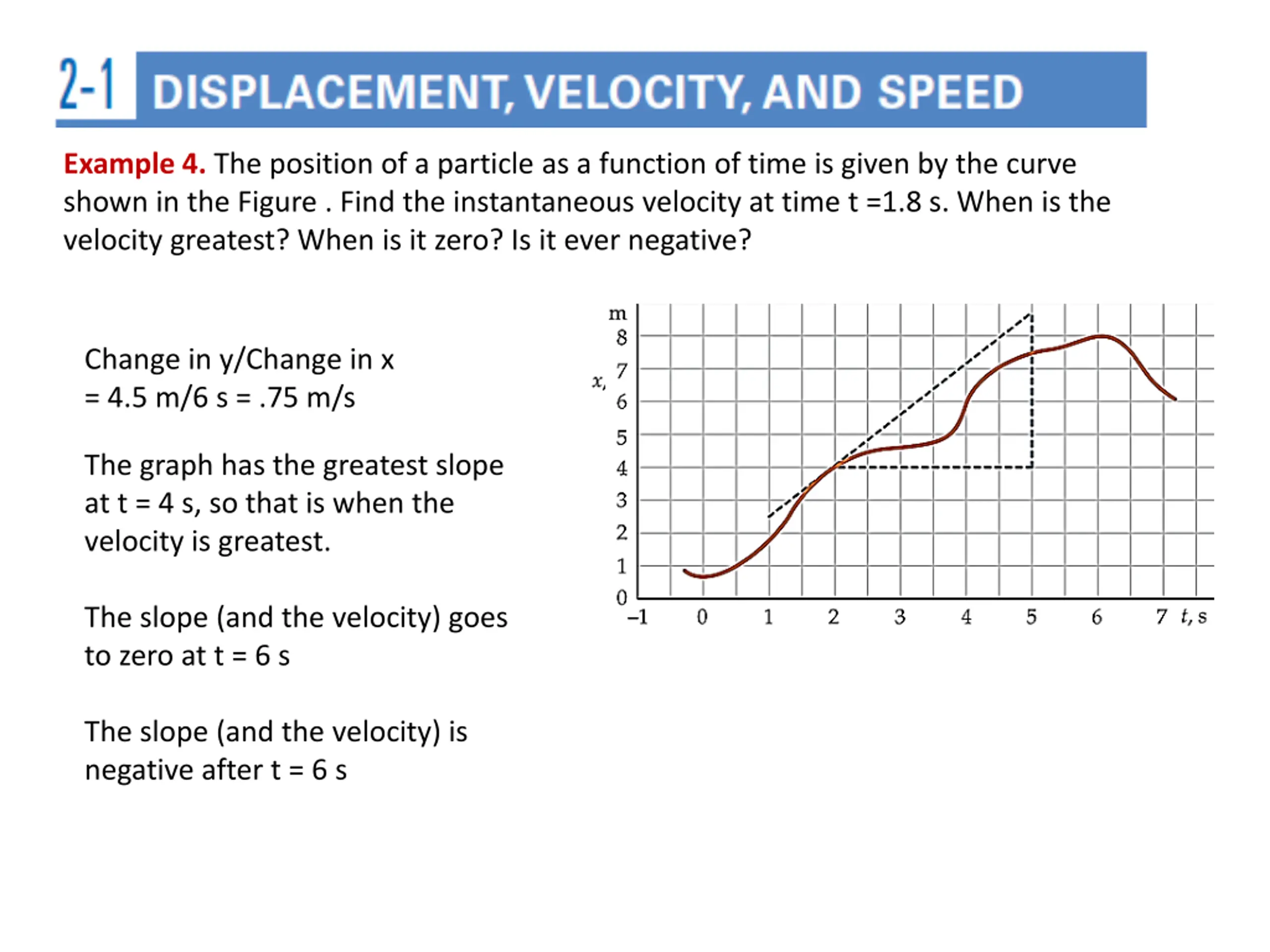Example 4. The position of a particle as a function of time is given by the curve shown in the Figure . Find the instantaneous velocity at time t =1.8 s. When is the velocity greatest? When is it zero? Is it ever negative? Change in y/Change in x = 4.5 m/6 s = .75 m/s The graph has the greatest slope at t = 4 s, so that is when the velocity is greatest. The slope (and the velocity) goes to zero at t = 6 s The slope (and the velocity) is negative after t = 6 s