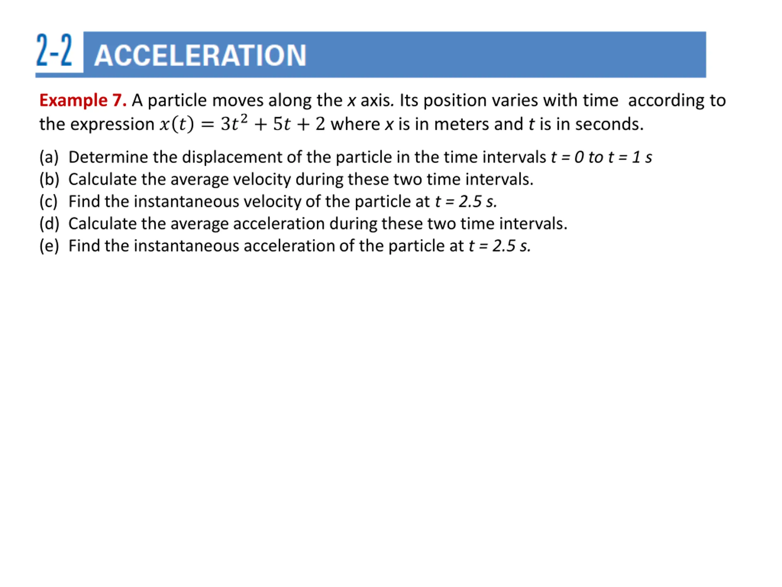 Example 7. A particle moves along the x axis. Its position varies with time according to the expression ? ? = 3?2+ 5? + 2 where x is in meters and t is in seconds. (a) Determine the displacement of the particle in the time intervals t = 0 to t = 1 s (b) Calculate the average velocity during these two time intervals. (c) Find the instantaneous velocity of the particle at t = 2.5 s. (d) Calculate the average acceleration during these two time intervals. (e) Find the instantaneous acceleration of the particle at t = 2.5 s.