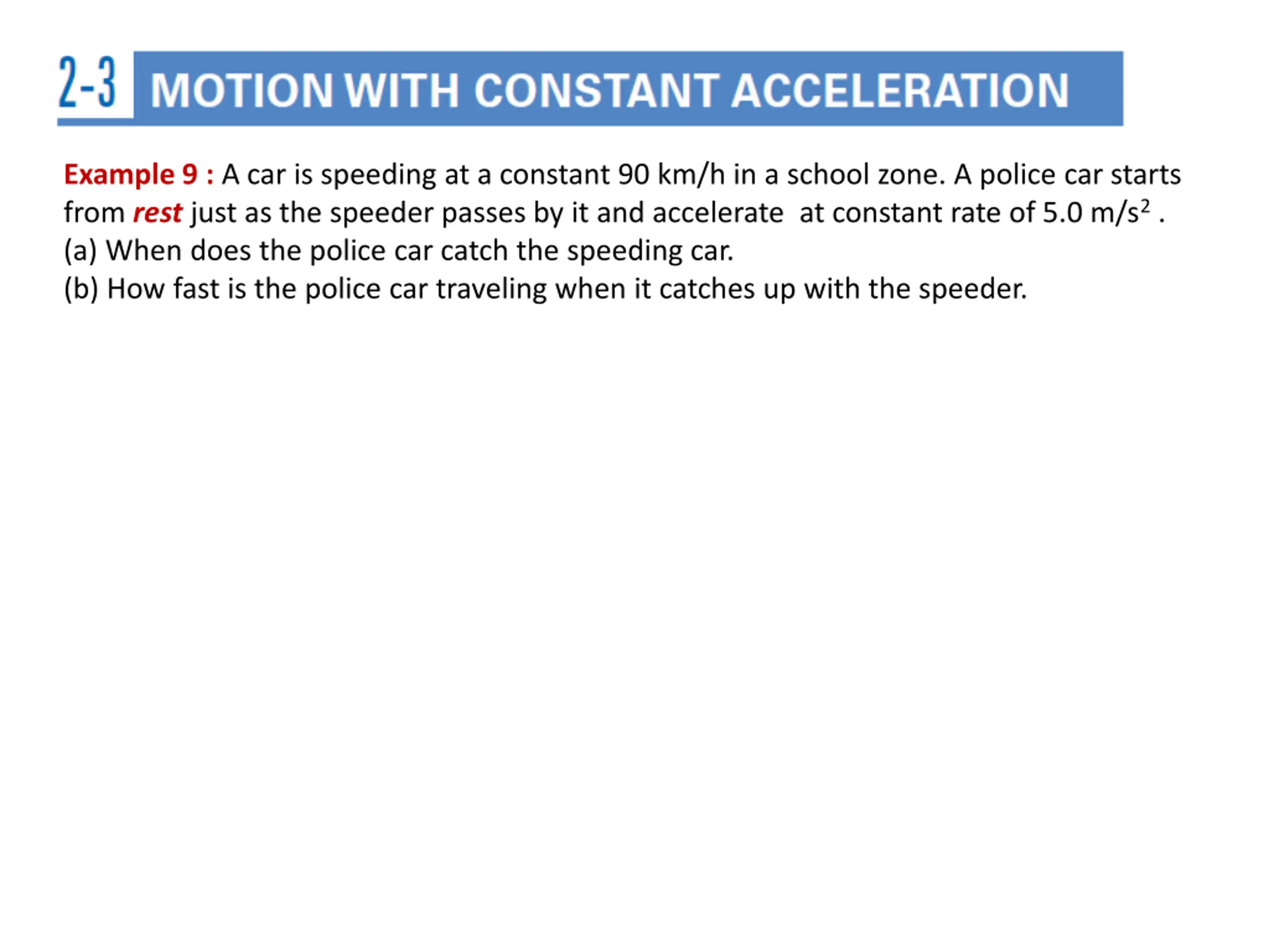 Example 9 : A car is speeding at a constant 90 km/h in a school zone. A police car starts from rest just as the speeder passes by it and accelerate at constant rate of 5.0 m/s2 . (a) When does the police car catch the speeding car. (b) How fast is the police car traveling when it catches up with the speeder.
