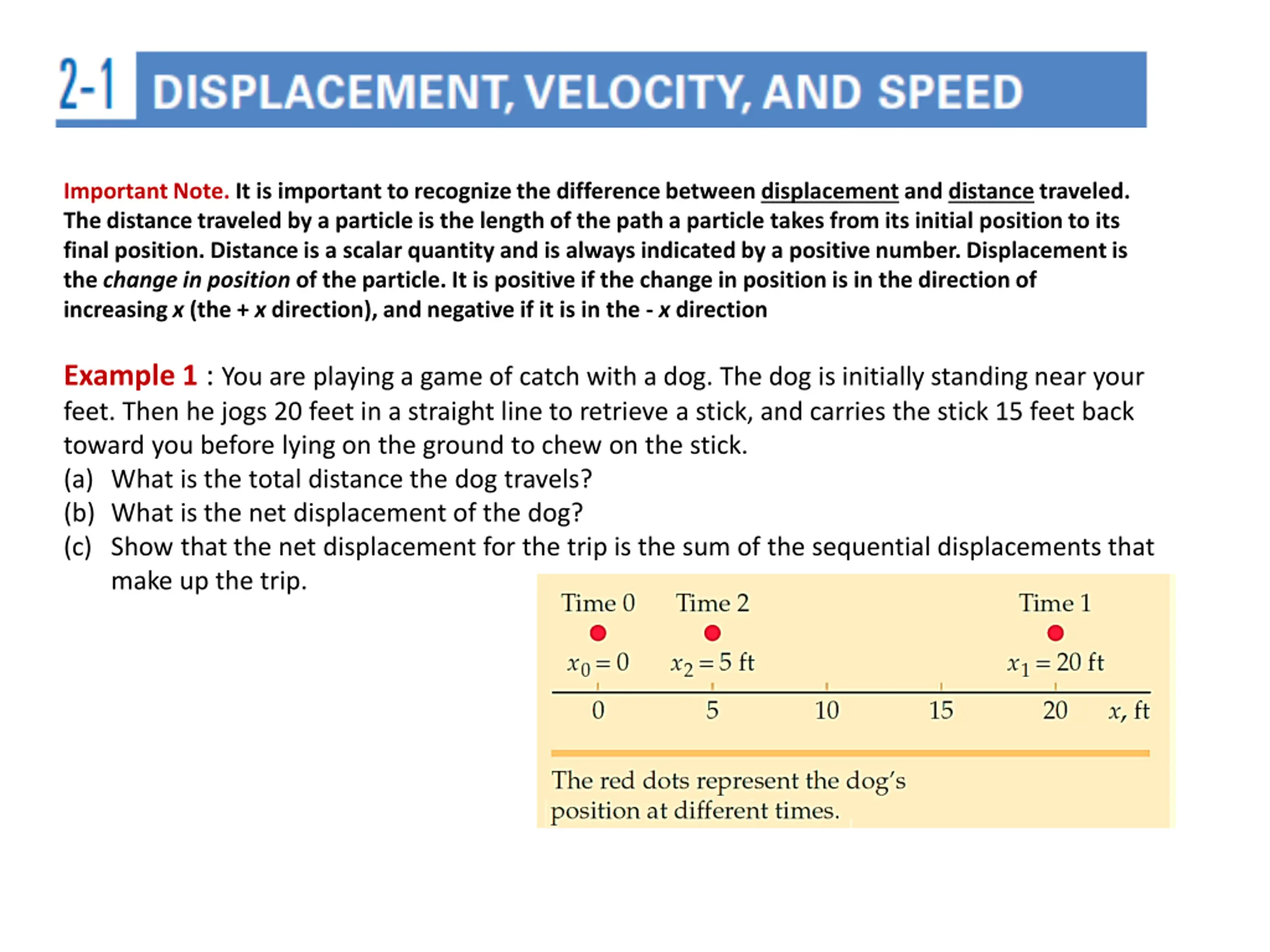Important Note. It is important to recognize the difference between displacement and distance traveled. The distance traveled by a particle is the length of the path a particle takes from its initial position to its final position. Distance is a scalar quantity and is always indicated by a positive number. Displacement is the change in position of the particle. It is positive if the change in position is in the direction of increasing x (the + x direction), and negative if it is in the - x direction Example 1 : You are playing a game of catch with a dog. The dog is initially standing near your feet. Then he jogs 20 feet in a straight line to retrieve a stick, and carries the stick 15 feet back toward you before lying on the ground to chew on the stick. (a) What is the total distance the dog travels? (b) What is the net displacement of the dog? (c) Show that the net displacement for the trip is the sum of the sequential displacements that make up the trip.