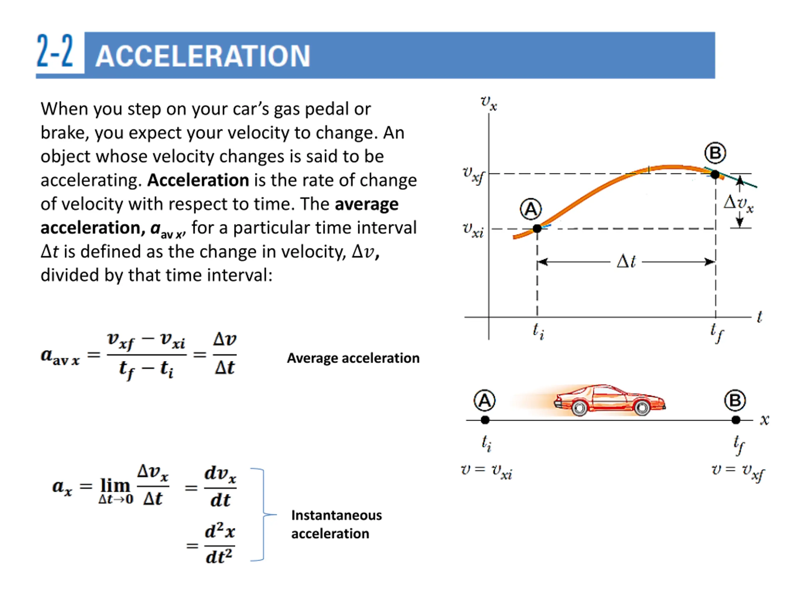 When you step on your cars gas pedal or brake, you expect your velocity to change. An object whose velocity changes is said to be accelerating. Acceleration is the rate of change of velocity with respect to time. The average acceleration, aav x, for a particular time interval t is defined as the change in velocity, ?, divided by that time interval: Average acceleration Instantaneous acceleration