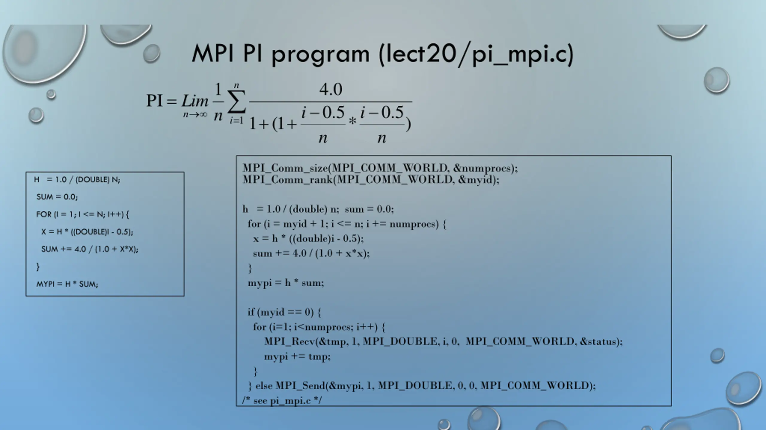 MPI PI program (lect20/pi_mpi.c) 1 0 . 4 n = i = PI Lim 5 . 0 5 . 0 i i n n + + 1 1 ( * ) 1 n n MPI_Comm_size(MPI_COMM_WORLD, &numprocs); MPI_Comm_rank(MPI_COMM_WORLD, &myid); H = 1.0 / (DOUBLE) N; SUM = 0.0; h = 1.0 / (double) n; sum = 0.0; for (i = myid + 1; i <= n; i += numprocs) { x = h * ((double)i - 0.5); sum += 4.0 / (1.0 + x*x); } mypi = h * sum; FOR (I = 1; I <= N; I++) { X = H * ((DOUBLE)I - 0.5); SUM += 4.0 / (1.0 + X*X); } MYPI = H * SUM; if (myid == 0) { for (i=1; i<numprocs; i++) { MPI_Recv(&tmp, 1, MPI_DOUBLE, i, 0, MPI_COMM_WORLD, &status); mypi += tmp; } } else MPI_Send(&mypi, 1, MPI_DOUBLE, 0, 0, MPI_COMM_WORLD); /* see pi_mpi.c */