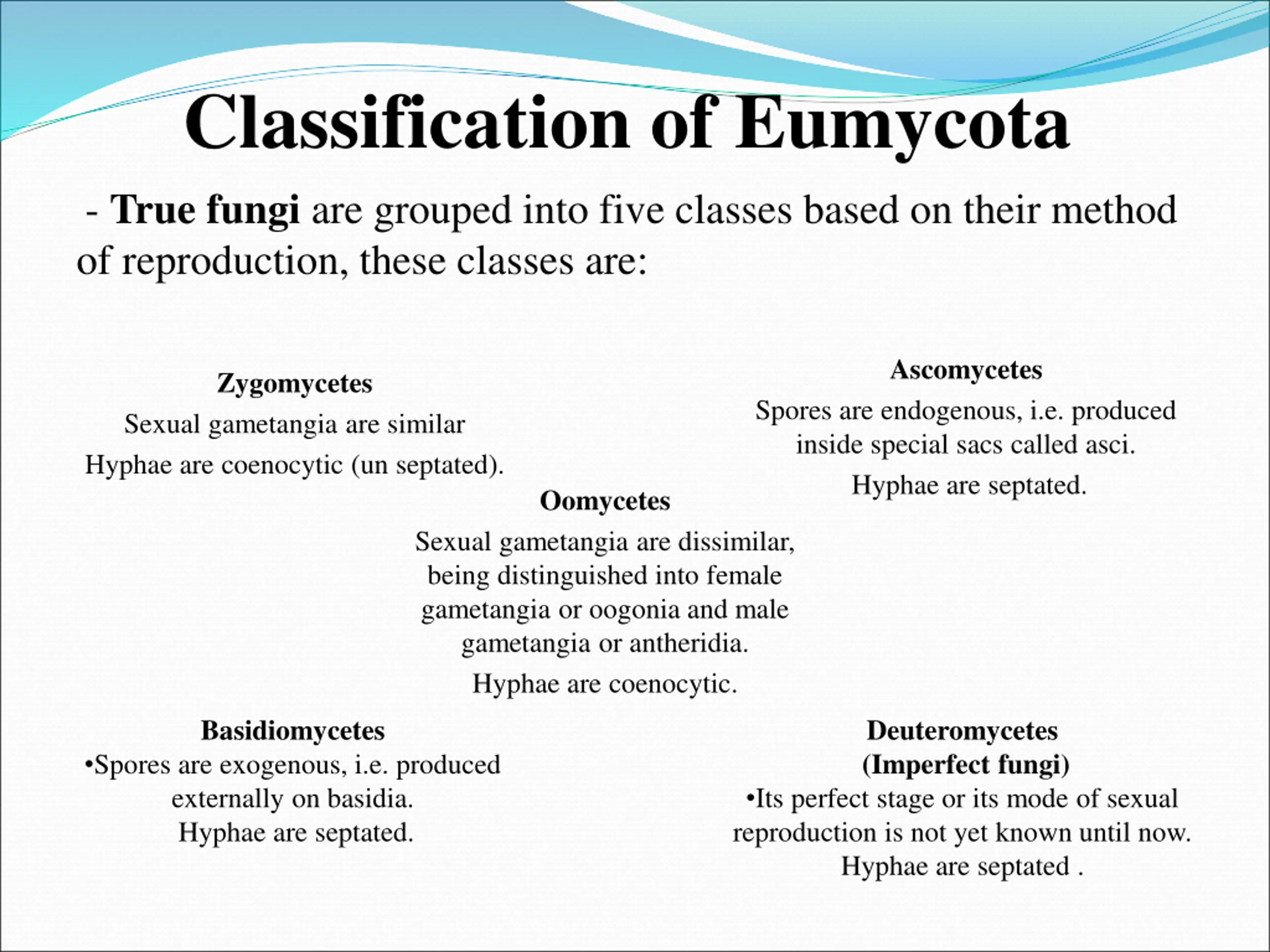 Classification of Eumycota - True fungi are grouped into five classes based on their method of reproduction, these classes are: Ascomycetes Zygomycetes Spores are endogenous, i.e. produced inside special sacs called asci. Hyphae are septated. Sexual gametangia are similar Hyphae are coenocytic (un septated). Oomycetes Sexual gametangia are dissimilar, being distinguished into female gametangia or oogonia and male gametangia or antheridia. Hyphae are coenocytic. Basidiomycetes Deuteromycetes (Imperfect fungi) Spores are exogenous, i.e. produced externally on basidia. Hyphae are septated. Its perfect stage or its mode of sexual reproduction is not yet known until now. Hyphae are septated .
